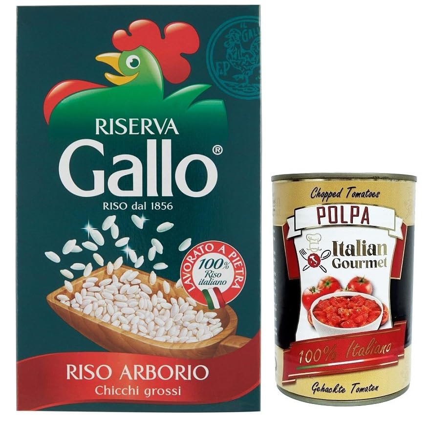 Italian Gourmet E.R. Gallo Riso Arborio Riserva 100% Italian rice cooking time 15 minutes 1 kg pack + Italian Gourmet Polpa di Pomodoro 400 g