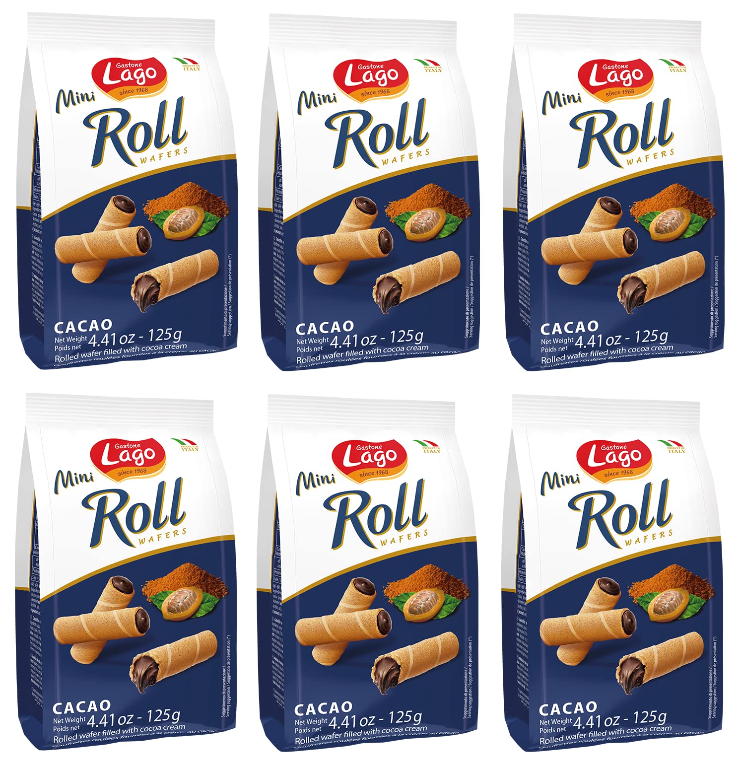 Gastone Lago Lot de 6 mini rouleaux de gaufres Cacao remplis de crème de cacao 125 g