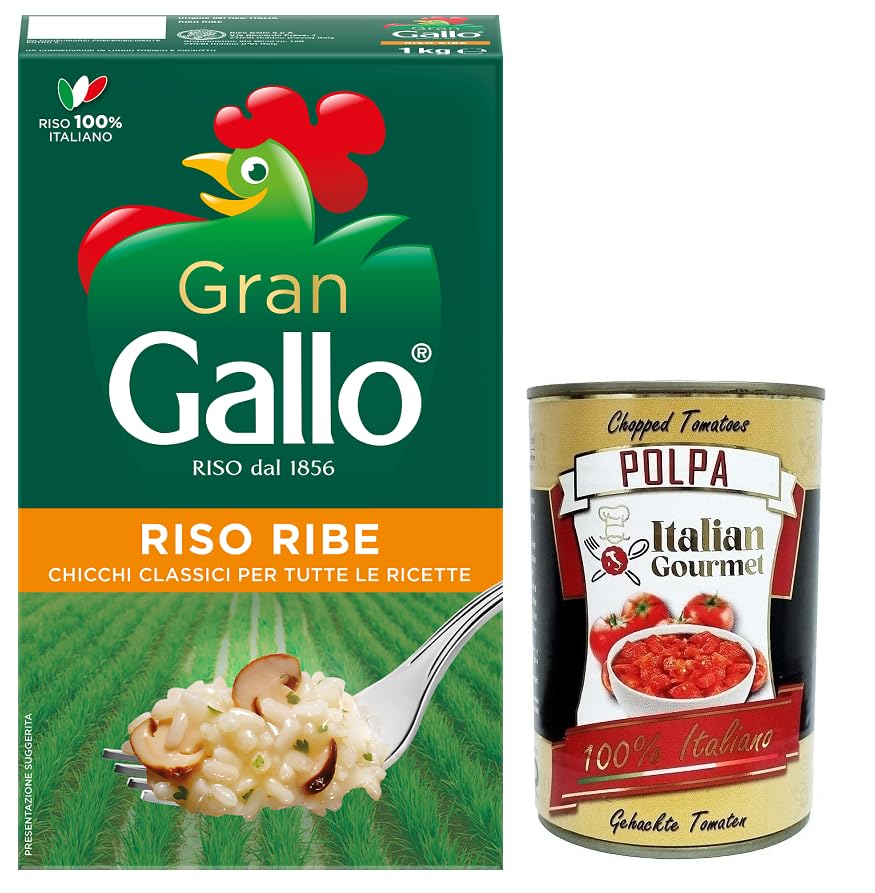 Riz Gran Gallo Riso Ribe 100 italien, idéal pour tout type de recette, temps de cuisson 15 minutes, paquet de 1 kg boîte italienne Gourmet Polpa di Pomodoro 400 g