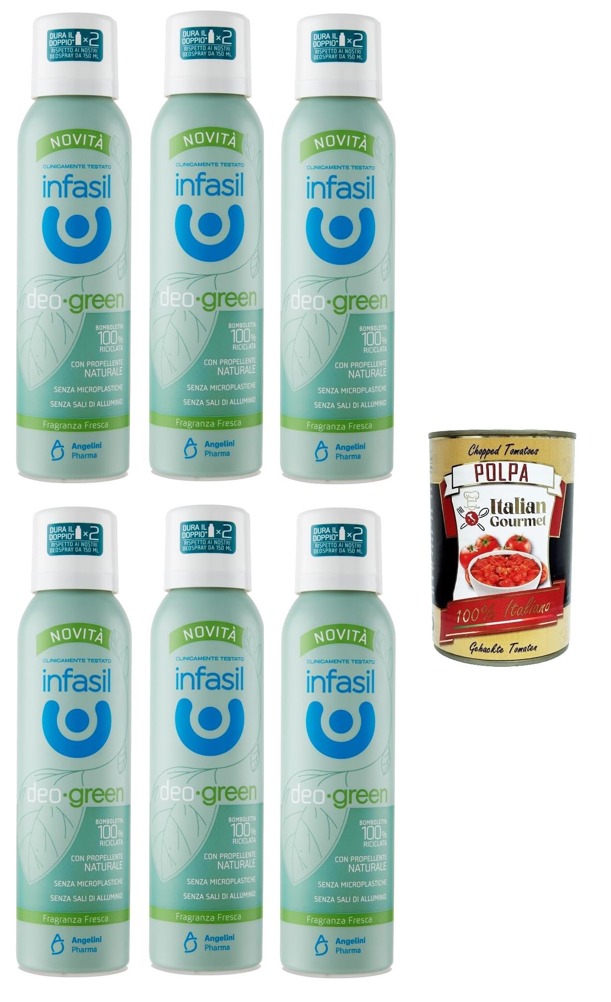 Ingredients: Linalool, Triethyl Citrate, Hexyl Cinnamal, Propanediol, Citral, Nitrogen, Fragrance, Limonene, Denat. INGREDIENTS Ingredients: Linalool, Triethyl Citrate, Hexyl Cinnamal, Propanediol, Citral, Nitrogen, Fragrance, Limonene, Denat. SAFETY WARNING Product packaging may contain different information than that shown on our website. Always read the label, warnings, and directions on the product before use or consumption. See moreIngredients: Linalool, triethyl citrate, hexyl cinnamal, propanediol, citral, nitrogen, fragrance, limonene, denat. 100 recycled tin. Free of microplastics and aluminum salts. It features a fresh scent and is ideal even for the most sensitive skin. Furthermore, it is environmentally friendly as it contains a natural propellant, nitrogen, which is not harmful to the environment, and the tin is made from 100 recycled aluminum. Choose unlimited protection with Infasil Green Spray deodorant! Its special formula, free of microplastics and aluminum salts, contains 97 natural ingredients and effectively protects you from perspiration and unpleasant odors. Free 400g Italian gourmet bottle.Infasil Lot de 6 déodorants Green Fragranza Fresca, sans microplastiques ni sels d'aluminium, 100 recyclé, 6 x 125 ml Italian Gourmet Polpa 400 gDESCRIPTION DU PRODUIT DESCRIPTION DU PRODUIT Ingrédients : linalol, citrate de triéthyle, hexyl cinnamal, propanediol, citral, nitrogène, parfum, limonène, alcool dénaté. INGRÉDIENTS Ingrédients : linalol, citrate de triéthyle, hexyl cinnamal, propanediol, citral, nitrogène, parfum, limonène, alcool dénaté. AVERTISSEMENT DE SÉCURITÉ L'emballage du produit peut contenir des informations différentes de celles affichées sur notre site Web. Veuillez toujours lire l'étiquette, les avertissements et les instructions sur le produit avant d'utiliser ou de consommer. Voir plusIngrédients : linalol, citrate de triéthyle, hexyl cinnamal, propanediol, citral, nitrogène, parfum, limonène, alcool dénaté. Boîte 100 recyclée. Sans microplastique ni sels d'aluminium. Il se caractérise par un parfum frais et est idéal même pour les peaux les plus sensibles. En outre, il est respectueux de l'environnement car il contient un propulseur naturel, de l'azote qui n'est pas nocif pour l'environnement et la boîte est fabriquée en aluminium 100 recyclé. Optez pour une protection illimitée avec le déodorant Infasil Green Spray ! Sa formule spéciale sans microplastiques ni sels d'aluminium contient 97 d'ingrédients naturels et vous protège efficacement de la transpiration et des mauvaises odeurs. Flacon gourmet italien gratuit 400 g.