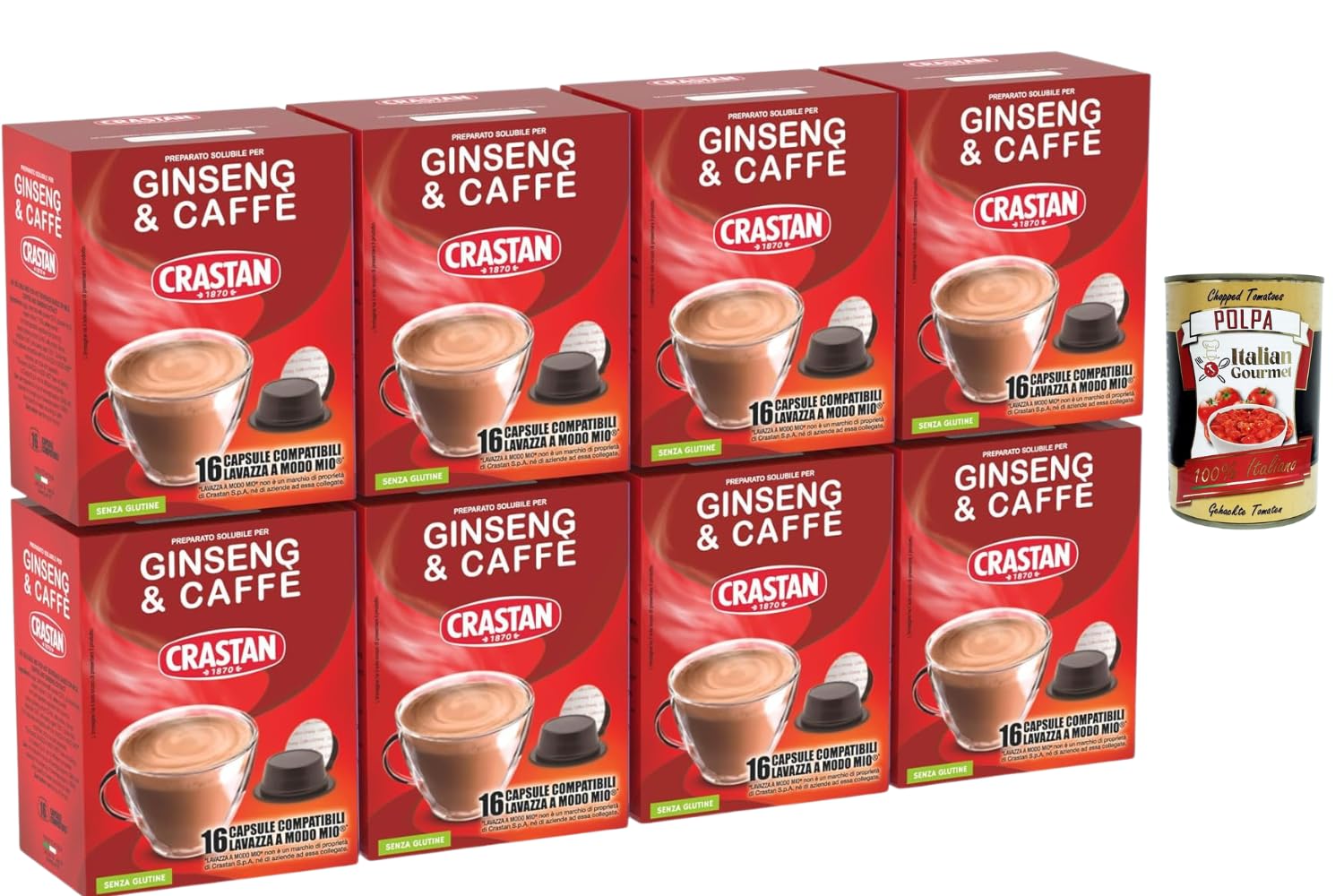 Italian Gourmet 128-Capsule Pack of Coffee and Ginseng (8 x 16) compatible with the A Modo Mio system and Italian Gourmet Polpa. Enjoy a creamy and aromatic ginseng coffee beverage in a convenient capsule format: simply insert, start, and serve in seconds. Perfect for breakfast, a break at the office, or a quick treat in between—no measuring, no mess. Pack of 8 boxes of 16 capsules 128 servings. Convenience: quick preparation in the capsule system. Taste: creamy, full-bodied, pleasantly aromatic. Everyday use: ideal for home, guests, the office, and home offices. Pack includes Italian Gourmet Polpa (canned tomato pulp). Serving suggestion: Add hot milk for a latte or enjoy over ice. Polpa is ideal for tomato sauces, pizzas, or Mediterranean recipes. INGREDIENTS Ingredients: Sugar, skimmed milk powder (22 ), glucose syrup, instant coffee (11.5 ), whey powder, non-hydrogenated vegetable fats (coconut), Panax ginseng extract (0.4 ), milk proteins, flavoring, stabilizer E451, release agent: E551. SAFETY WARNING Contains milk and coconut - May contain traces of other allergens. MANUFACTURER'S DETAILS CRASTAN S.p.A., Via Maremmana 24 • Zona Industriale Gello, 56025, Pontedera (PI), Italy See moreItalian Gourmet Lot de 128 capsules de café et ginseng (8 x 16) compatibles avec le système A Modo Mio Café crémeux au ginseng rapide et facile, sans gluten Pack de conservation Italian GourmetDESCRIPTION DU PRODUIT DESCRIPTION DU PRODUIT Italian Gourmet Lot de 128 capsules de café et de ginseng (8 x 16) compatibles avec le système A Modo Mio et Italian Gourmet Polpa. Profitez d'une boisson crémeuse et aromatique au café au ginseng en forme de capsule pratique : il suffit de l'insérer, de démarrer et de servir en quelques secondes. Parfait pour le petit déjeuner, la pause au bureau ou le plaisir rapide entre les deux, sans mesures, sans encombrement. Lot de 8 boîtes de 16 capsules 128 portions. Confort : préparation rapide dans le système de capsule. Goût : crémeux, corsé, agréablement aromatique. Usage quotidien : idéal pour la maison, les invités, le bureau et le bureau à domicile. Lot : y compris Italian Gourmet Polpa (pulpe de tomate en boîte). Astuce de service : ajoutez du lait chaud pour un café latte ou savourez sur de la glace. Le polpa est idéal pour les sauces tomate, les pizzas ou les recettes méditerranéennes. INGRÉDIENTS Ingrédients : sucre, lait écrémé en poudre (22 ), sirop de glucose, café instantané (11,5 ), lactosérum en poudre, graisses végétales non hydrogénées (noix de coco), extrait de ginseng Panax (0,4 ), protéines de lait, arôme, stabilisateur E451, agent de démoulage : E551. AVERTISSEMENT DE SÉCURITÉ Contient du lait et de la noix de coco - Peut contenir des traces d'autres allergènes COORDONNÉES DU FABRICANT CRASTAN S.p.A., Via Maremmana 24 • Zona Industriale Gello, 56025, Pontedera (PI), IT Voir plus