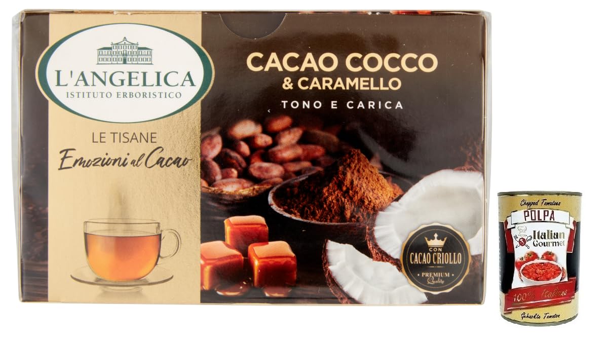 L'Angelica Tisana al Cacao Cocco e Caramello, tisane de cacao, noix de coco et caramel, lot de 15 filtres boîte italienne Gourmet Polpa di Pomodoro 400 g