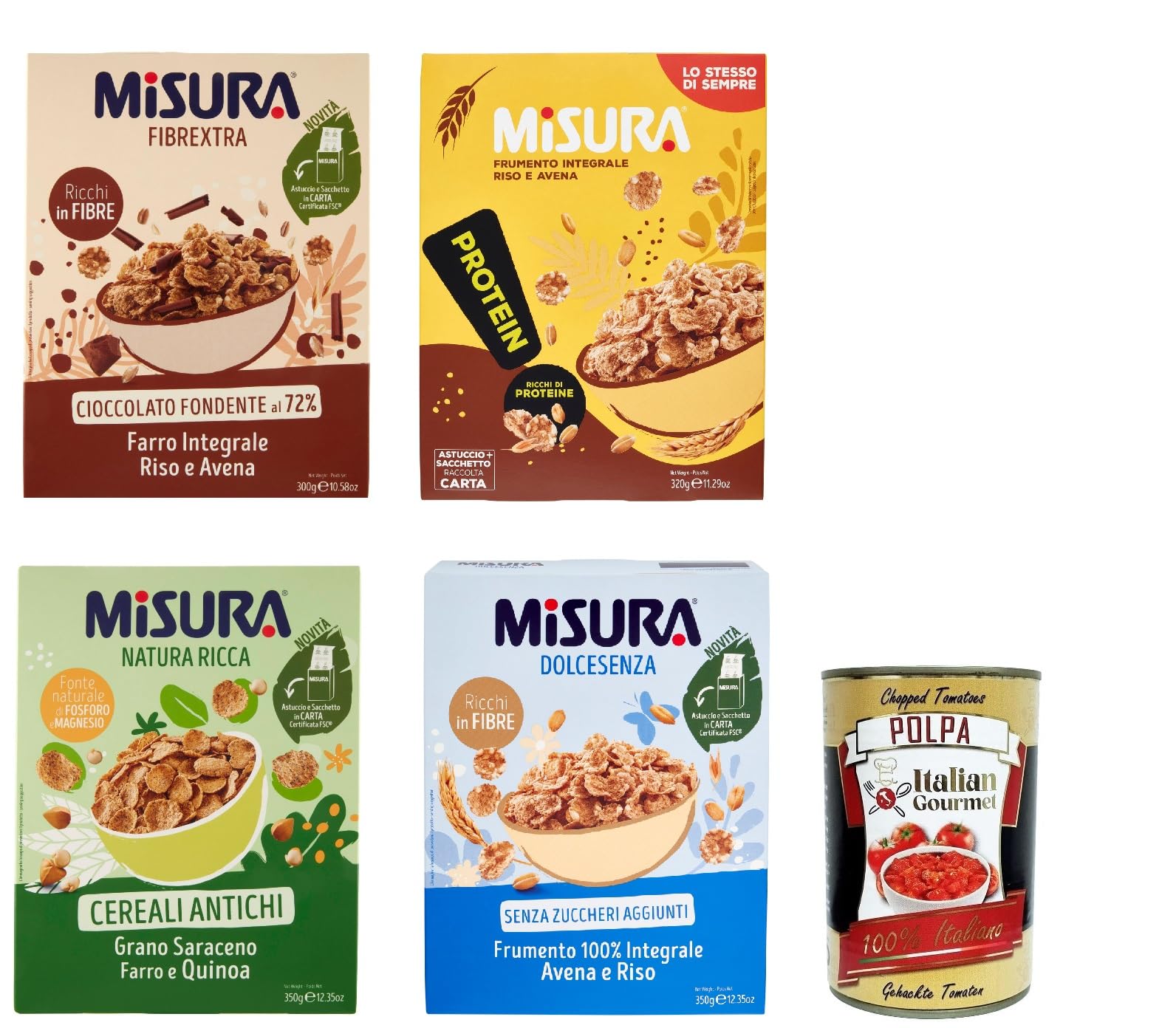 Misura Cereali Paquet de test céréales Fibraextra, protéines, Natura Ricca, Dolcesenza, bouclier complet, riz et grains entiers, 4 x 300 g Italian Gourmet polpa 400 g