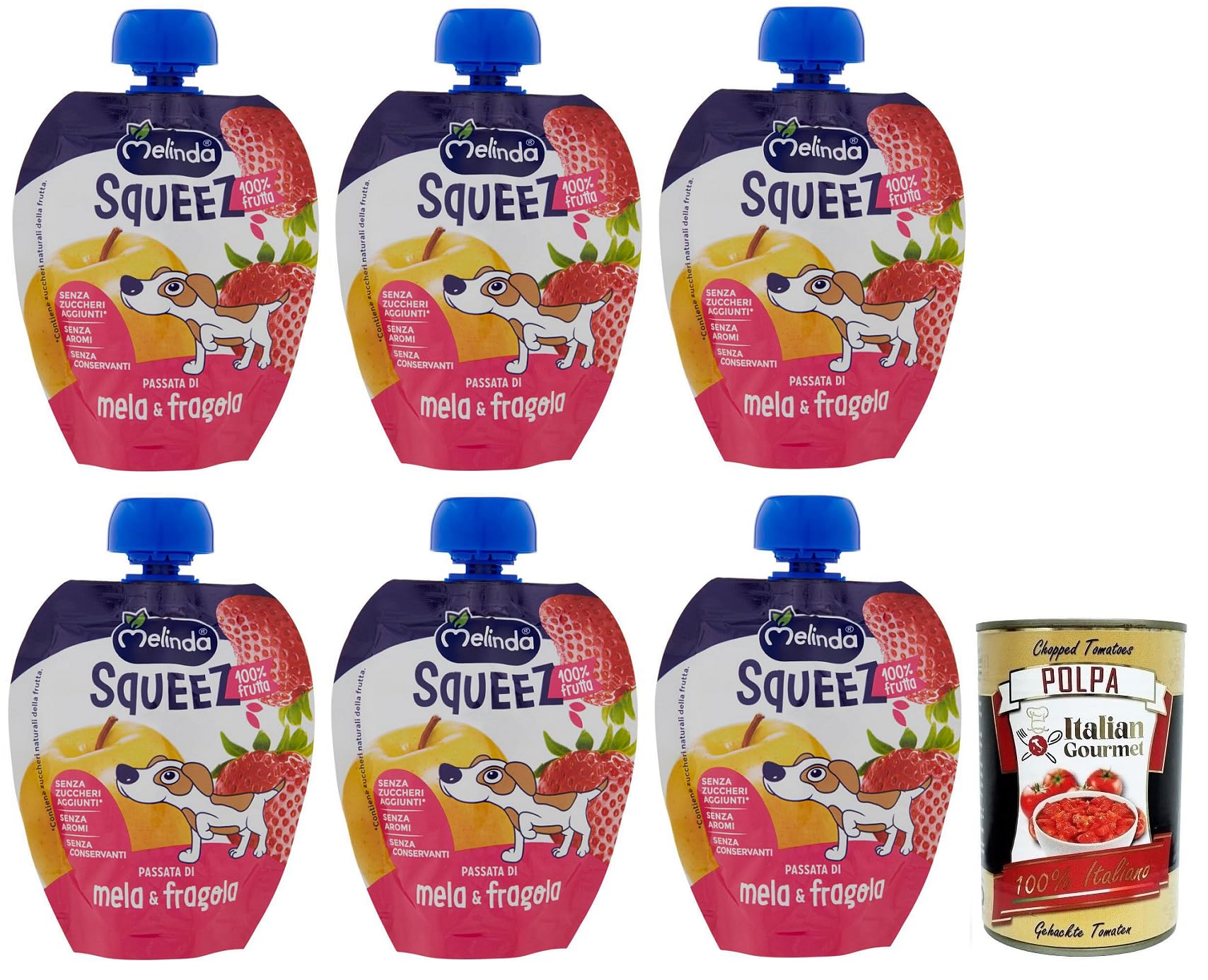 Italian Gourmet E.R. Melinda Mela Fragola Squeez 6-pack of 100% apple and strawberry fruit purees (90g each) + 400g box