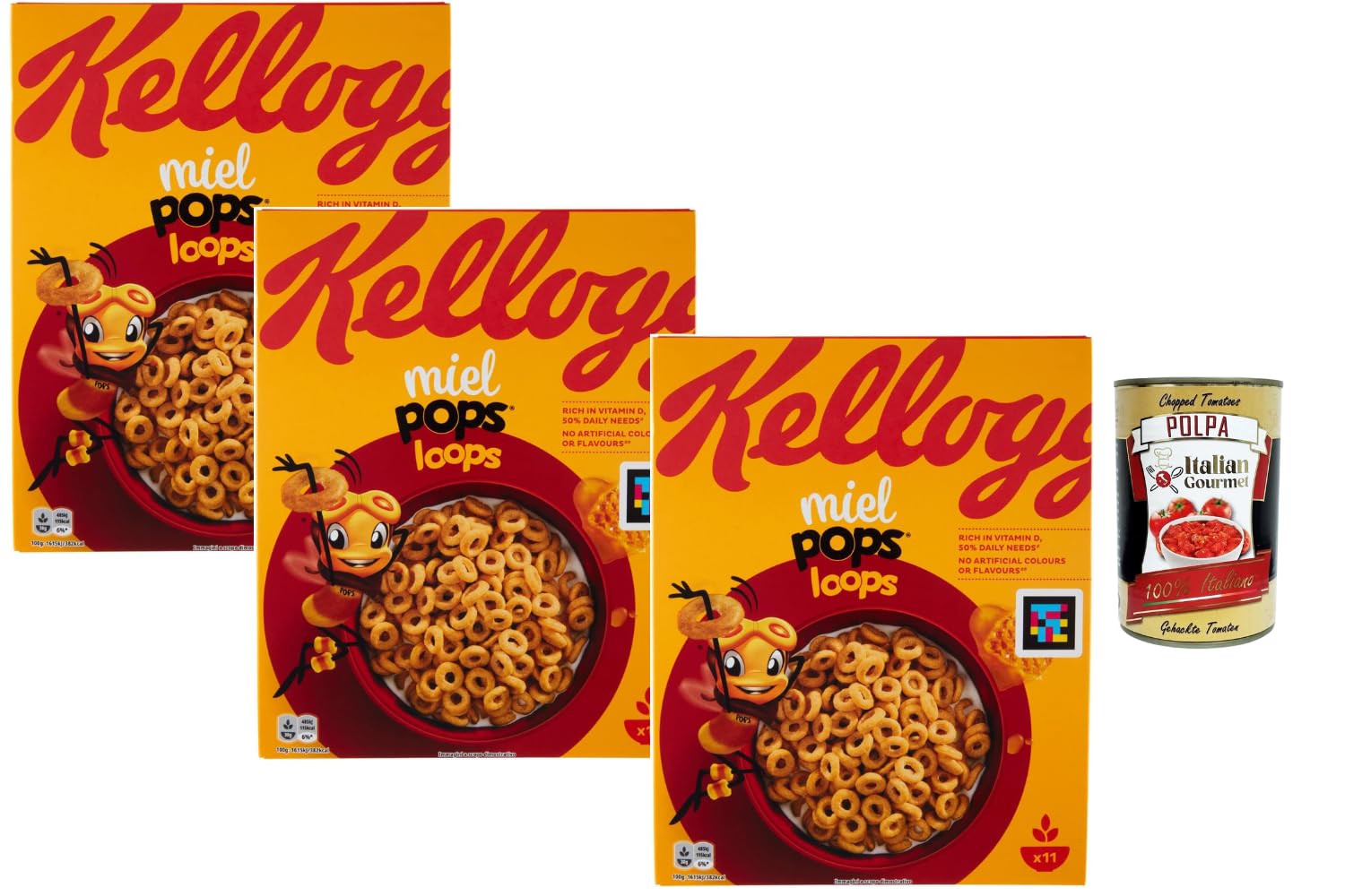 Italian Gourmet E.R. Miel Pops Loops Cereal Honey Ring Set Crispy Cereal with Vitamin D 3 x 330g for Kids and Adults + Italian Gourmet Polpa
