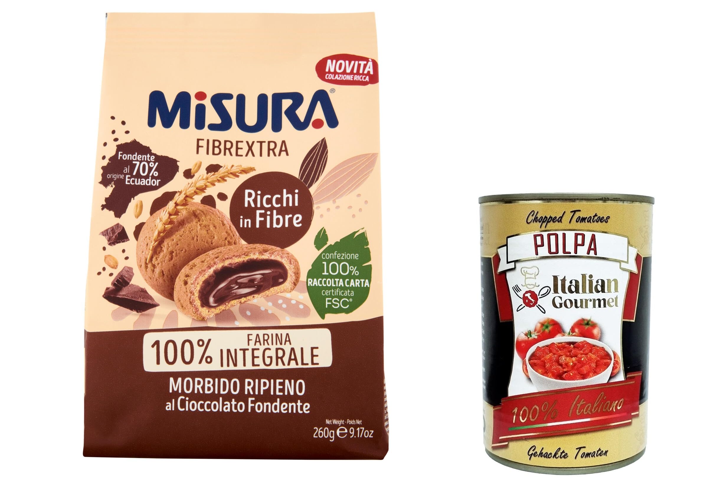 Italian Gourmet E.R. Misura Fibrextra Whole Wheat Cookies Filled with Chocolate Set of 12 Whole Cookies Filled with Dark Chocolate 100% Whole Wheat Flour Rich in Fiber 260 g + Gourmet Italian Pulp 400 g