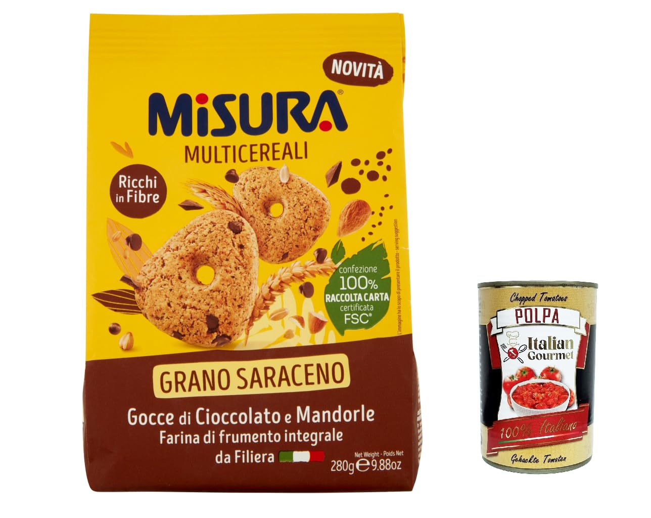 Italian Gourmet E.R. Misura Multicereali Pack of 3 multigrain buckwheat biscuits with chocolate chips and almonds 280g + gourmet Italian polpa 400g
