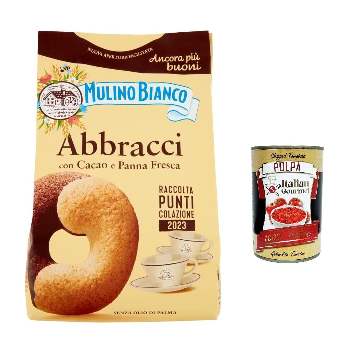 Italian Gourmet E.R. Mulino Bianco Abbracci Pack of 10 cocoa and fresh cream shortbread biscuits palm oil free 350g + Italian gourmet polpa 400g