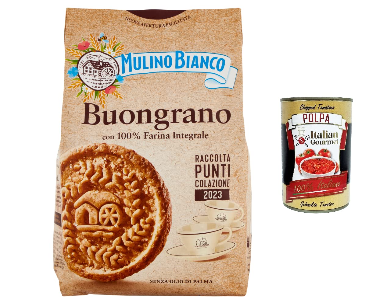 Italian Gourmet E.R. Mulino Bianco Buongrano Pack of 12 crispy whole grain biscuits 100% whole wheat flour 350g + Italian gourmet polpa 400g
