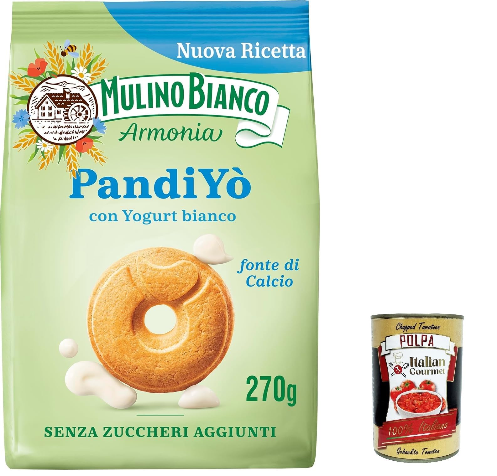 Italian Gourmet E.R. Mulino Bianco Pandiyo Pack of 12 sugar-free biscuits with yogurt and cereals 270g + gourmet Italian polpa 400g
