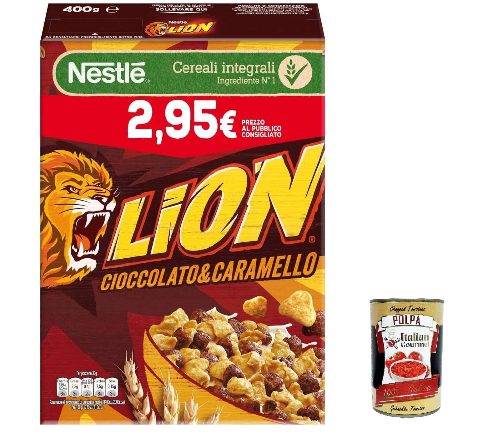 Italian Gourmet E.R. Nestl Lion Cereali Integrali Cioccolato e Caramello Lot of 6 whole cereals with chocolate and caramel 400 g + Italian Gourmet pulp 400 g
