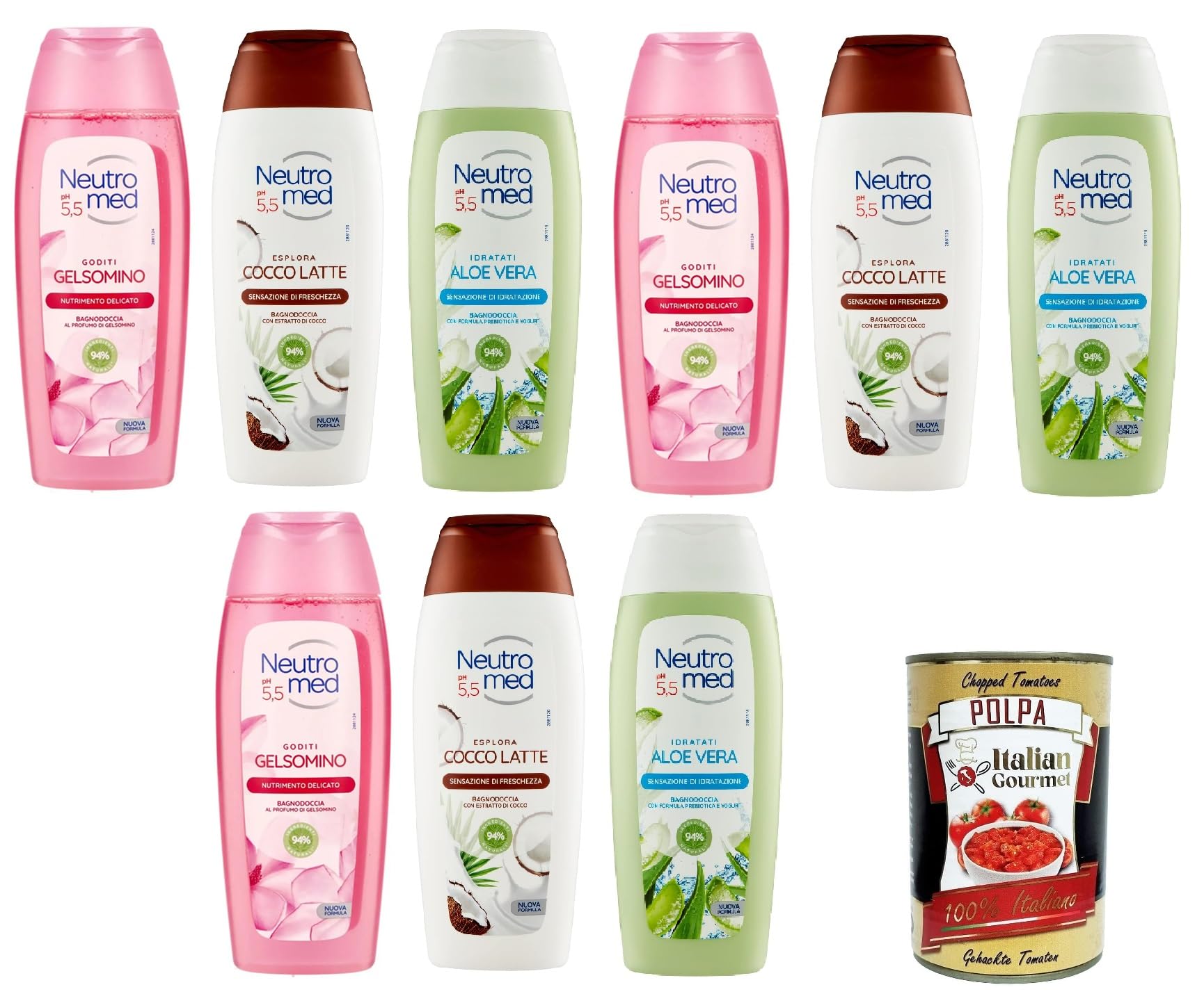 Jasmine Body Wash Discover Neutromed Jasmine Body Wash, an elixir of softness. With a gentle effect, it cleanses and nourishes your skin. Aloe Vera Yogurt Shower Gel Discover the new Neutromed Aloe Vera Yogurt Shower Gel and let yourself be enveloped in a moisturizing sensation. Coconut Milk Body Wash Discover Neutromed Coconut Milk Body Wash and let yourself be pampered by its refreshing effect that leaves skin soft and silky. Free Gourmet Italian Polpa di pomodoro, 400g.