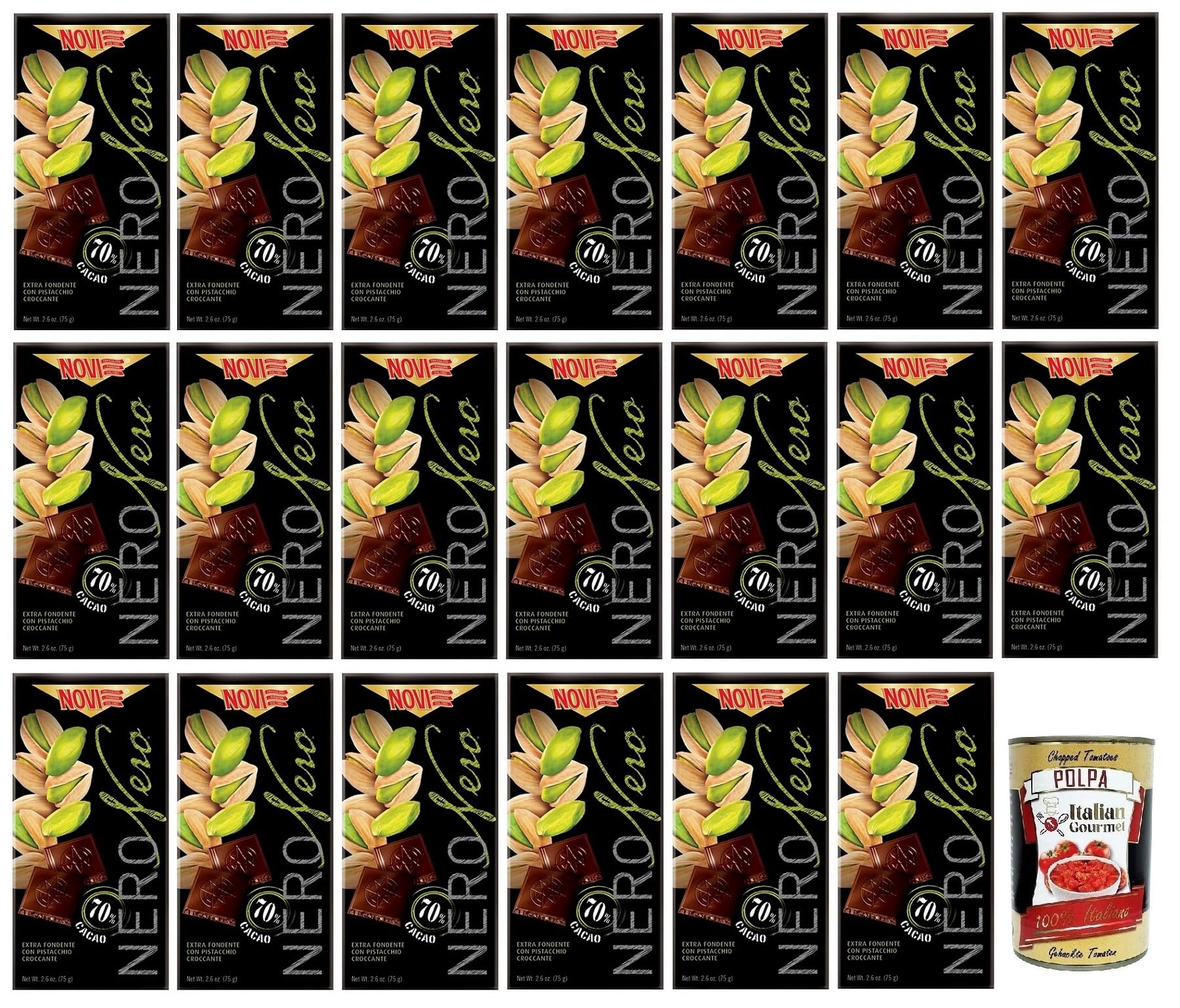 Novi Nero Pistacchio Lot de 20 chocolats extra noirs avec pistaches croustillantes 70 cacao 75 g Polpa di Pomodoro Italian Gourmet Polpa di Pomodoro Boîte de 400 g