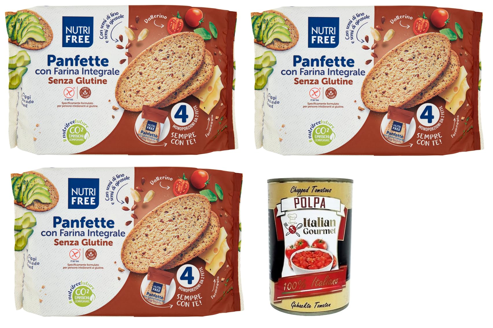 Nutrifree Panfette con Farina Integrale, pain sans gluten avec farine de sarr complet, paquet de 340 g boîte de 400 g Italian Gourmet Polpa di Pomodoro