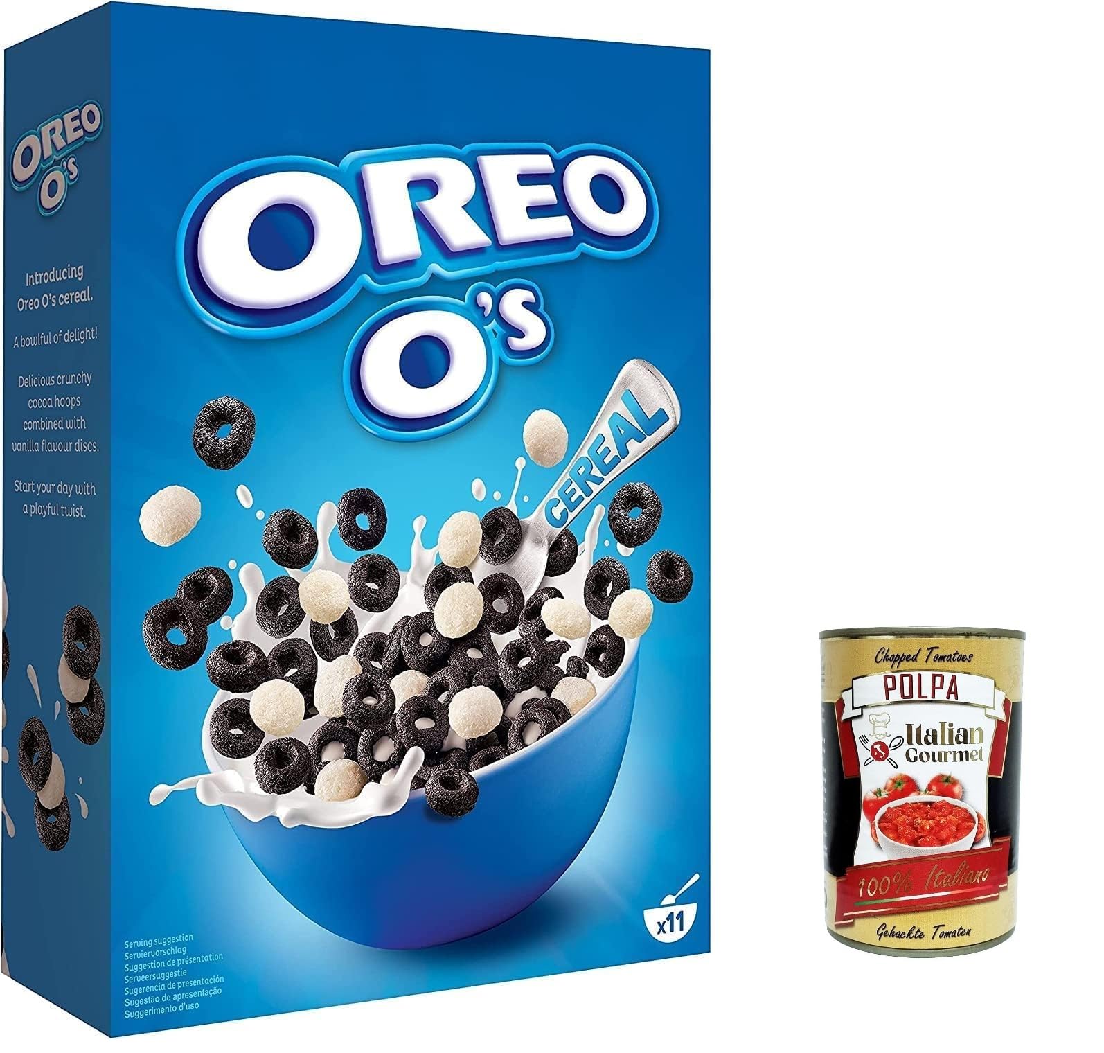 Italian Gourmet E.R. Oreo O's Cereal Pack of 12 Oreo cereals 350g in cocoa and vanilla flavor Oreo cereal for breakfast or a snack in between contains vitamins and iron + Italian Gourmet polpa 400g
