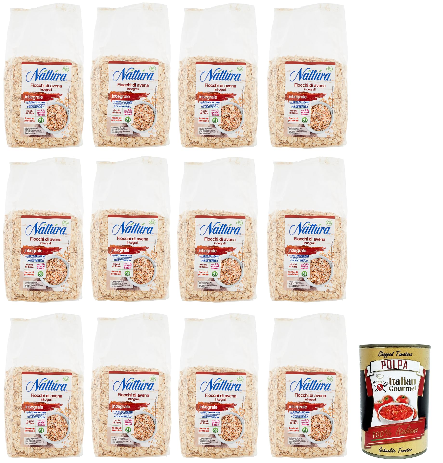 Náttúra Fiocchi di Avena Integrali BIO Lot de 12 flocons d'avoine à grains entiers issus de l'agriculture biologique, sachet de 500 g boîte italienne Gourmet Polpa di Pomodoro 400 g