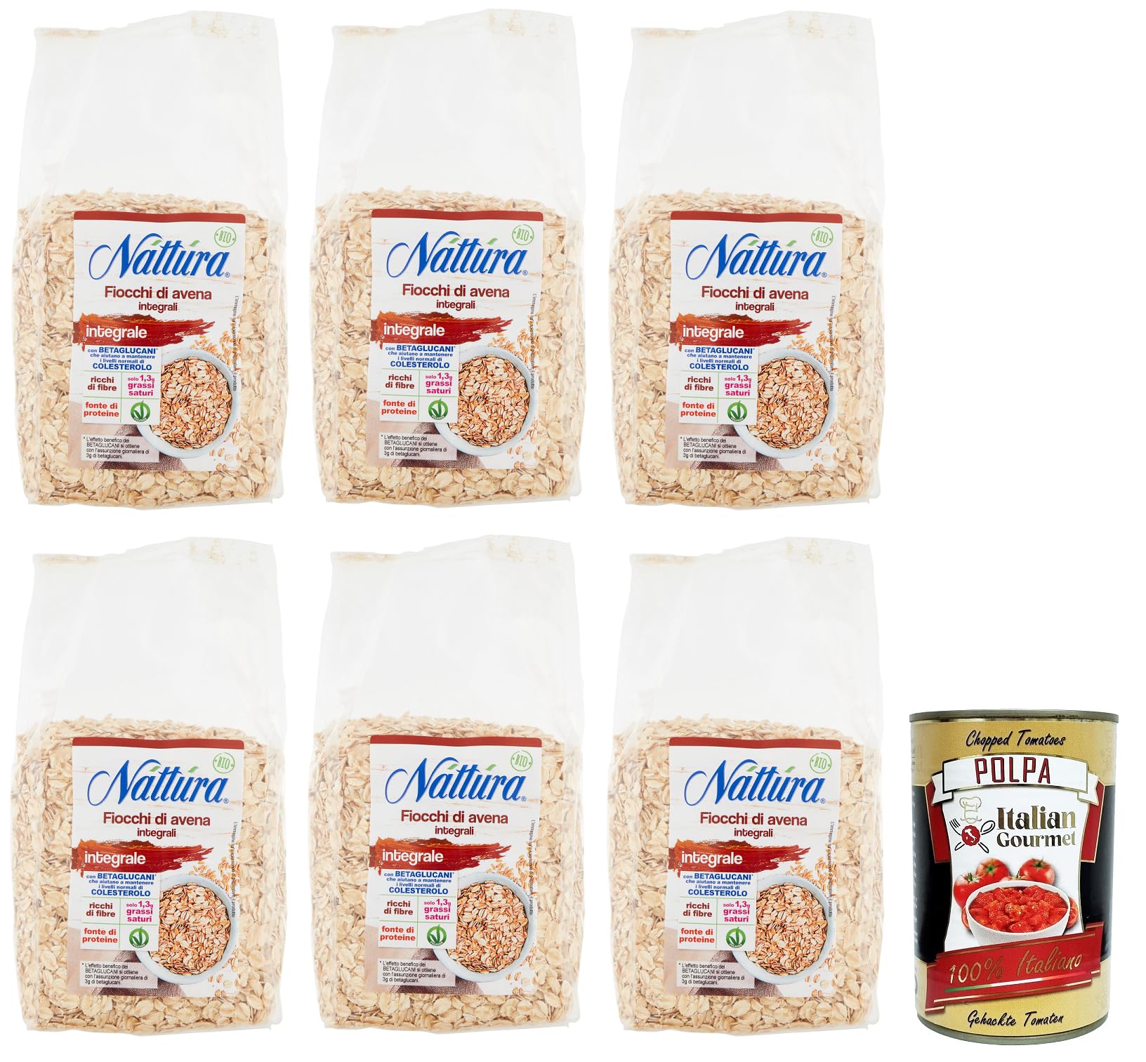 Náttúra Fiocchi di Avena Integrali BIO Lot de 6 flocons d'avoine à grains entiers issus de l'agriculture biologique, sachet de 500 g boîte italienne Gourmet Polpa di Pomodoro 400 g