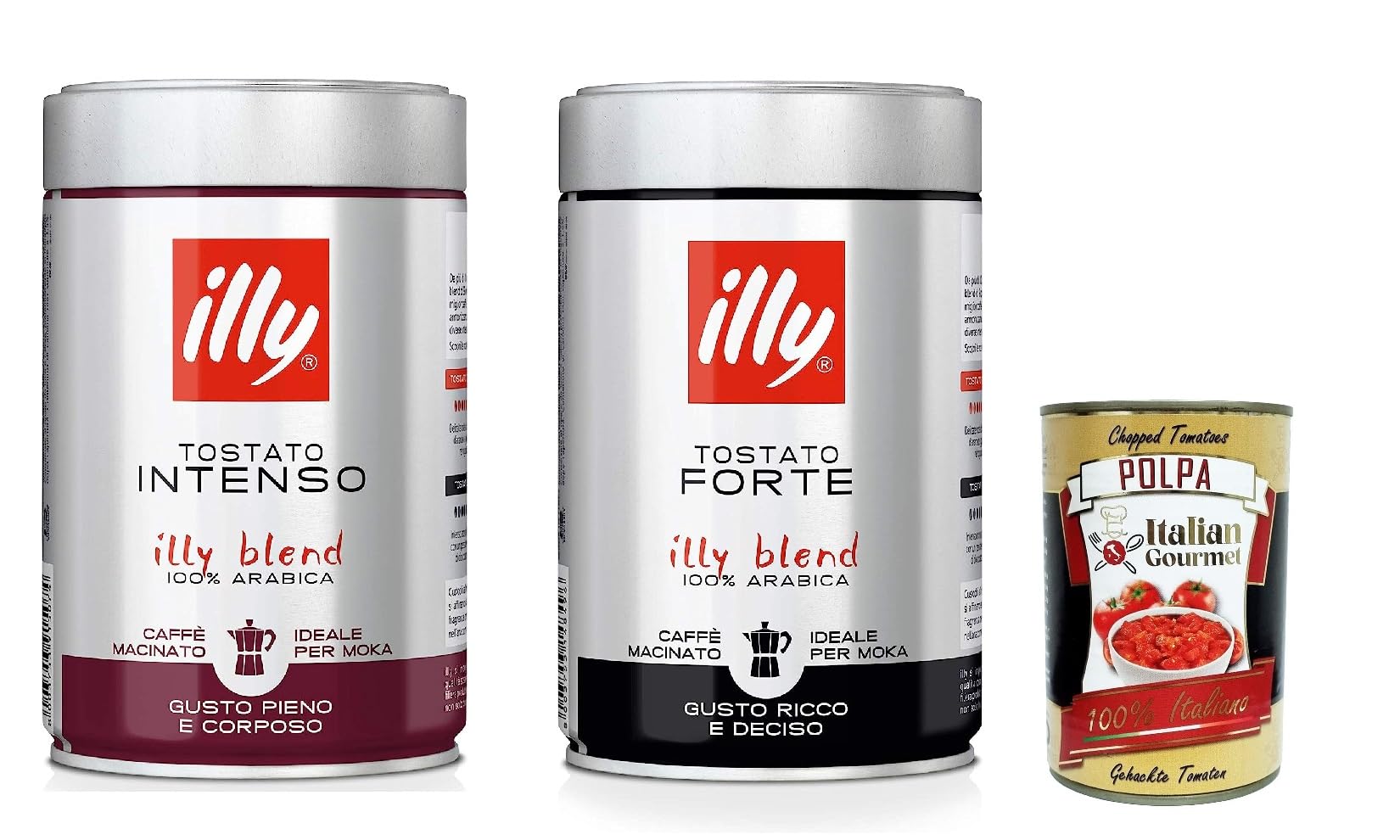 Italian Gourmet E.R. Pack of 2 packs of Illy Intenso and strong roast ground coffee 100% Arabica ground 2 x 250g + Italian Gourmet Polpa 400g