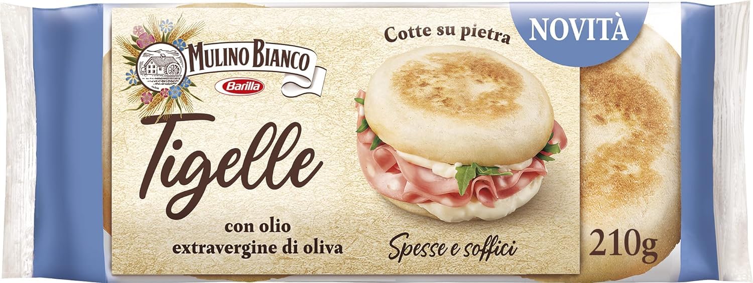 Italian Gourmet E.R. Pack of 9 Mulino Bianco tigelles in mild extra virgin olive oil - Lard-free - Thick and soft tigelle for filling - Pack of 6 210g tigelles + 400g gourmet Italian polpa