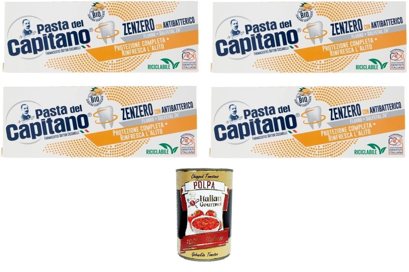A brand new product for consistently fresh breath. This toothpaste contains a precious, naturally sourced ingredient: ginger, an innovative and safe solution for the oral hygiene of the whole family. The result is a deep clean of the mouth and consistently fresh breath. Pasta del Capitano, long synonymous with safety and quality Made in Italy, now offers more environmentally friendly products: the new tube is made of PBL, an aluminum-free plastic, making it fully recyclable. An eco-friendly packaging solution with specific formulations to meet diverse oral hygiene needs.An environmentally friendly packaging solution with specific formulations to meet different oral hygiene needs. Pasta del Capitano, always synonymous with safety and quality Made in Italy, now offers more environmentally friendly products: the new tube is made of PBL, an aluminum-free plastic, making it fully recyclable. The toothpaste contains a precious ingredient of natural origin: ginger, an innovative and safe solution for the oral hygiene of the whole family. The result is a deep cleaning of the oral cavity and consistently fresh breath. A brand new product for always-fresh breath. Free Gourmet Italian Gourmet Polpa di pomodoro, 400g.Pasta del Capitano Dentifricio Zenzero Dentifricio Gingembre Dentifrice Protection complète des dents 4 x 100 ml Italian Gourmet Polpa 400 gDESCRIPTION DU PRODUIT Nouveauté absolue pour une haleine toujours fraîche Le dentifrice contient un ingrédient précieux d'origine naturelle : le gingembre, une solution innovante et sûre pour l'hygiène buccale de toute la famille. Le résultat est un nettoyage en profondeur de la cavité buccale et une haleine toujours fraîche. Pasta del Capitano, depuis toujours synonyme de sécurité et de qualité Made in Italy, propose désormais des produits plus respectueux de l'environnement : le nouveau tube est fabriqué en PBL, fabriqué en plastique sans aluminium, il est donc entièrement recyclable. Une solution d'emballage respectueuse de l'environnement, avec des formulations spécifiques pour répondre aux différents besoins d'hygiène bucco-dentaire.Une solution d'emballage respectueuse de l'environnement, avec des formulations spécifiques pour répondre aux différents besoins d'hygiène bucco-dentaire. Pasta del Capitano, depuis toujours synonyme de sécurité et de qualité Made in Italy, propose désormais des produits plus respectueux de l'environnement : le nouveau tube est fabriqué en PBL, fabriqué en plastique sans aluminium, il est donc entièrement recyclable. Le dentifrice contient un ingrédient précieux d'origine naturelle : le gingembre, une solution innovante et sûre pour l'hygiène buccale de toute la famille. Le résultat est un nettoyage en profondeur de la cavité buccale et une haleine toujours fraîche. Nouveauté absolue pour une haleine toujours fraîche. Gourmet Italian Gourmet Polpa di pomodoro gratuit, 400 g.
