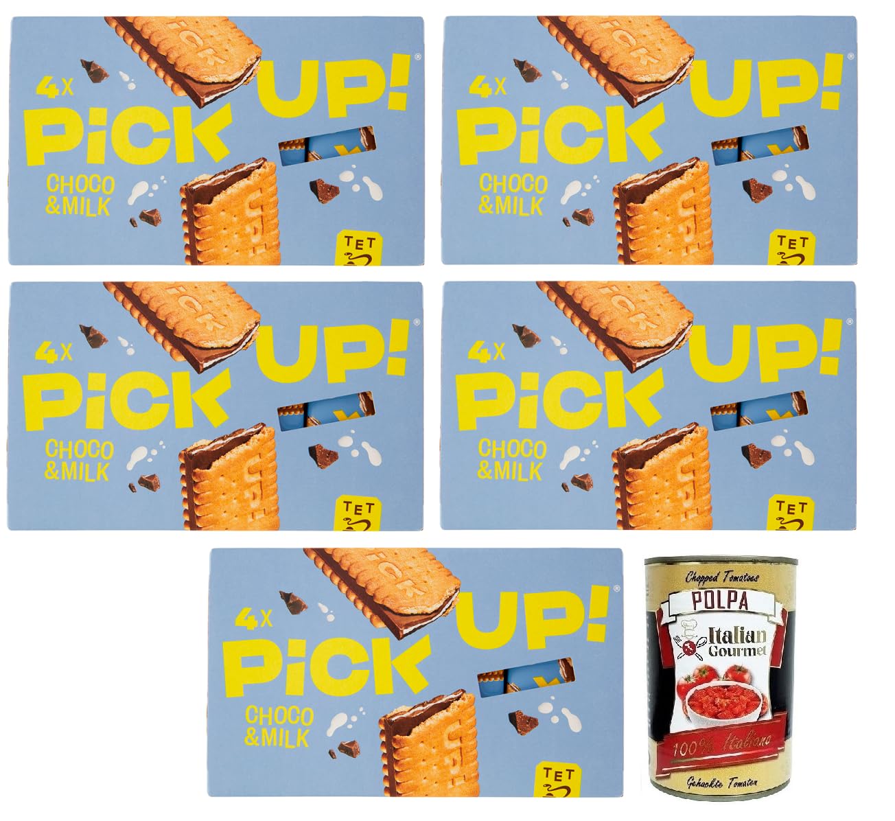 Italian Gourmet E.R. Pick Up Choco & Milk Set of 5 Milk Chocolate Bars with Milk Cream Filling in a Double Biscuit 128g Package Each Pack Contains 4 x 28g Cookies + Polpa di Pomodoro