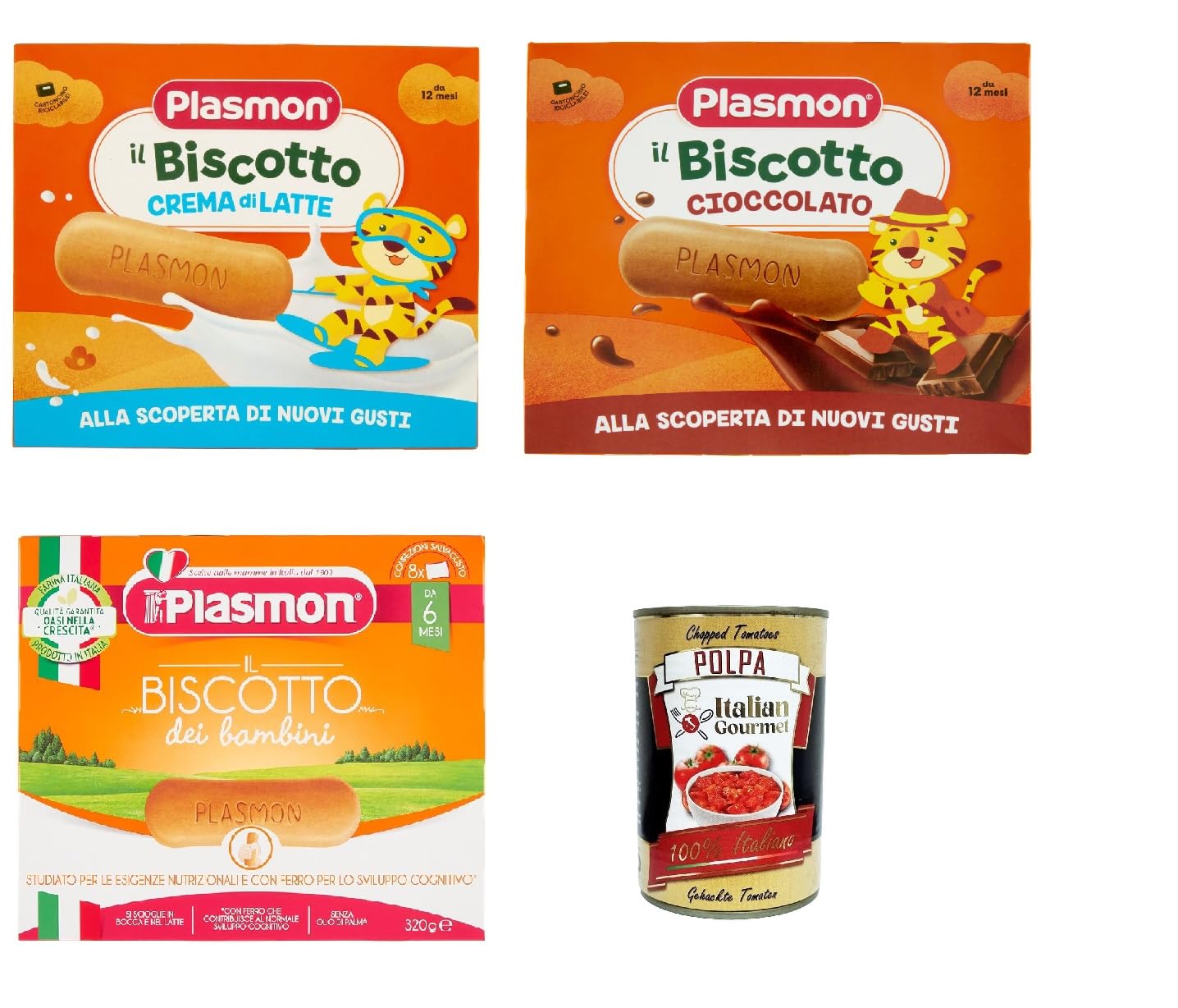 Pack test plasmon Biscotto classico, cioccolato e crema al latte 12 m 3 x 320 g Italian Gourmet polpa 400 g
