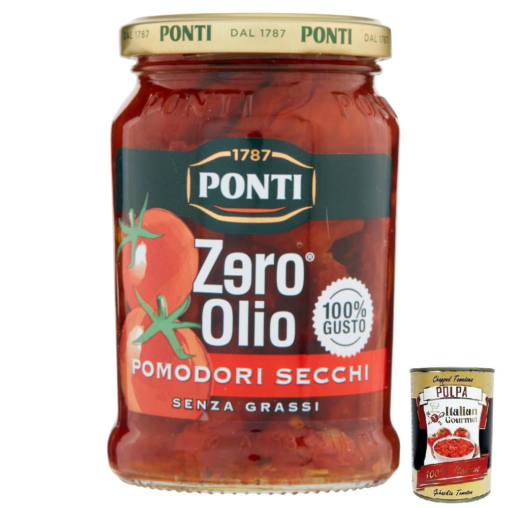 Gourmet Italian Gourmet Polpa di Pomodoro 400g - Thanks to the innovative formula developed in the Ponti Taste Laboratory, Zero Olio tomatoes retain the taste, fragrance, and aroma of tomatoes without using oil, only a natural sauce. Ideal as an appetizer or snack, excellent as a side dish, they will delight you whenever you want with their delicious and light flavor. Ingredients: dried tomatoes, preserving liquid (wine vinegar, sugar, salt, aromatic blend of herbs and spices, natural flavoring, thickener: xanthan gum, pectin, acidity regulator: citric acid). Average nutritional values per 100g of drained product. Energy value: 165 kJ 40 kcal - Fat 0.4 g, of which saturates 0.1 g - Carbohydrate: 4.6 g - Fiber 4.0 g - Protein 6.3 g - Salt 1.3 g - Fat-free. INGREDIENTS Sun-dried tomatoes, preserving liquid (wine vinegar, sugar, salt, aromatic blend of herbs and spices, natural flavoring, thickener: xanthan gum, pectin, acidity regulator: citric acid).Ponti Pomodori Secchi Zero Olio, sans huile, tomates séchées, non gras, pot de 300 g boîte italienne Gourmet Polpa di Pomodoro 400 gDESCRIPTION DU PRODUIT DESCRIPTION DU PRODUIT Gourmet Italian Gourmet Polpa di Pomodoro 400 g - Grâce à la formule innovante développée dans le laboratoire Ponti Taste Laboratory, les tomates Zero Olio conservent le goût, le parfum et l'arôme des tomates sans utiliser d'huile mais seulement une sauce naturelle. Idéal pour l'apéritif ou l'apéritif, excellent comme accompagnement, ils vous gâteront quand vous le souhaitez avec beaucoup de goût et de légèreté. Ingrédients : tomates séchées, liquide de conservation (vinaigre de vin, sucre, sel, mélange aromatique d'herbes et d'épices, arôme naturel, épaississant : xanthane, pectine, régulateur d'acidité : acide citrique). Valeurs nutritionnelles moyennes pour 100 g de produit égoutté. Valeur énergétique : 165 kJ 40 kcal - Matières grasses 0,4 g dont acides gras saturés 0,1 g - Glucides : 4,6 g - 4,0 g de fibres - 6,3 g de protéines - 1,3 g de sel - 1,8 g - Sans graisse. INGRÉDIENTS Tomates séchées, liquide de conservation (vinaigre de vin, sucre, sel, mélange aromatique d'herbes et d'épices, arôme naturel, épaississant : xanthane, pectine, régulateur d'acidité : acide citrique).