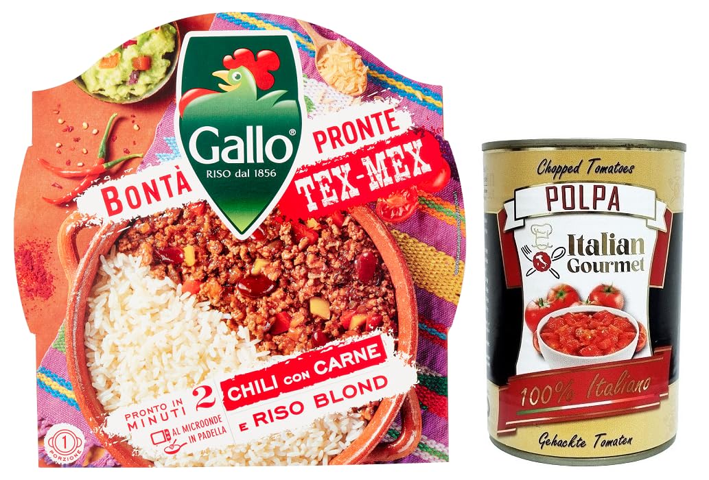 Riso Gallo Bontà Pronte Tex-Mex Chili con Carne, préparation précuite à base de riz étuvé, haricots, viande et poivrons 220 g Italian Gourmet Polpa di Pomodoro 400 g