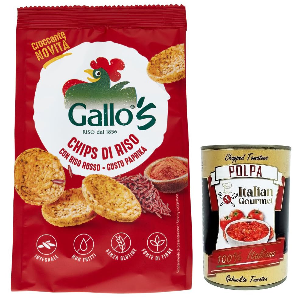 Riso Gallo Chips con Riso Rosso, snack avec goût de riz rouge et poivron complet, sachet de 40 g boîte italienne Gourmet Polpa di Pomodoro 400 g