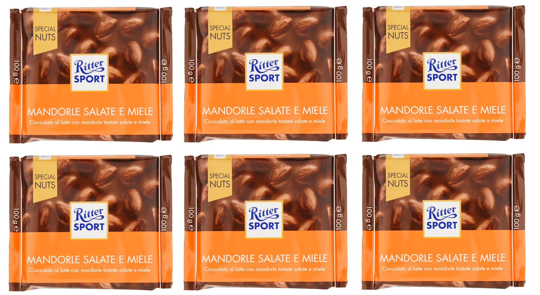 What is the Salted Almonds and Honey bar? A drop of honey? A hint of salt? Delicious whole almonds? Here's a little hint: it's all of them. Because it's only the combination of these three ingredients in RITTER SPORT whole milk chocolate that makes our bar so delicious. Now you have three good reasons to try it. What are you waiting for? Ingredients: Salted almonds with a honey coating [almonds (20 ), sugar, honey (0.9 ), vegetable oil (rapeseed, thistle, sunflower), salt, maltodextrin], cocoa butter, cocoa mass, whole milk powder, skimmed lactose, water-free butter powder, emulsifier: soy lecithin. May contain traces of peanuts and other nuts. Contains cereals. Allergens: Contains almonds. May contain cereals containing gluten. May contain eggs. Contains lactose. Contains milk. May contain nuts. Contains peanuts. Average nutritional values per 100g: Energy 2346 kJ (563 kcal). Fat 35g - of which saturates 15g. Protein 9.0g. Salt 0.26g. INGREDIENTS Sugar, Honey-coated Salted Almonds [almonds (20 ), sugar, honey (0.9 ), vegetable oil (rapeseed, thistle, sunflower), salt, maltodextrin], cocoa butter, cocoa mass, milk powder, lactose, skimmed milk powder, anhydrous butter, emulsifier: soy lecithin. May contain traces of peanuts, other nuts, cereals, and eggs.Ritter Sport Special Nuts Mandorle Salade e Miele Chocolat au lait avec amandes grillées et miel 100 gDESCRIPTION DU PRODUIT DESCRIPTION DU PRODUIT Qu'est-ce que la barre Salted Almonds and Honey ? Une goutte de miel ? Une légère note de sel ? De délicieuses amandes entières ? Petite astuce : de tout. Car c'est seulement la combinaison de ces trois ingrédients dans le chocolat au lait entier RITTER SPORT qui rend notre référence si délicieuse. Maintenant, vous avez trois bonnes raisons de l'essayer. Qu'attendez-vous ? Ingrédients : sucres amandes salées avec couche de miel [amandes (20 ), sucre, miel (0,9 ), huile végétale (colza, chardon, tournesol), sel, maltodextrin] beurre de cacao, pâte de cacao, lait en poudre, lactose écrémé poudre de beurre sans eau, émulsifiant : lécithine de soja. Il peut contenir des traces de cacahuètes, autres fruits à coque. céréales riches Contient des allergènes : contient des amandes. Peut contenir des céréales contenant du gluten. Peut contenir des œufs. Contient du lactose. Contient du lait. Peut contenir des fruits à coque. Contient des cacahuètes. Contient des valeurs nutritives moyennes pour 100 g : énergie 2346 kJ (563 kcal). Graisse 35 g - dont acides gras saturés 15 g 50 g - dont sucre 48 g de protéines 9,0 g de sel 0,26 g. INGRÉDIENTS Sucre Amandes salées avec enrobage de miel [amandes (20 ), sucre, miel (0,9 ), huile végétale (colza, chardon, tournesol), sel, maltodextrine] beurre de cacao pâte de cacao lait en poudre lactose lait écrémé en poudre Beurre anhydre Émulsifiant: lécithine de soja Il peut contenir des traces d'arachides, autres fruits à coque céréales contenant et les œufs contiennent