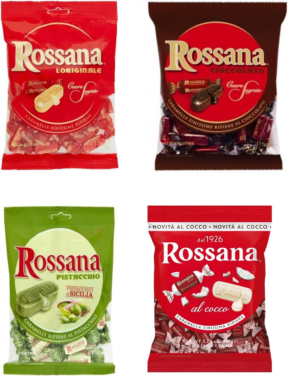 Rossana Mix Bonbons 4 variétés (Classique, Chocolat, Pistache, Coco) 4 x 175 g - Bonbons italiens farcis au caramel italien, sans gluten, coffret cadeau Italian Gourmet Polpa