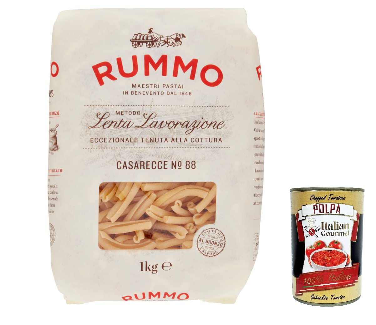 Italian Gourmet E.R. Rummo Casarecce No. 88 Durum Wheat Semolina Pasta 1 kg + Italian Gourmet Pulp 400 g Pack of 12
