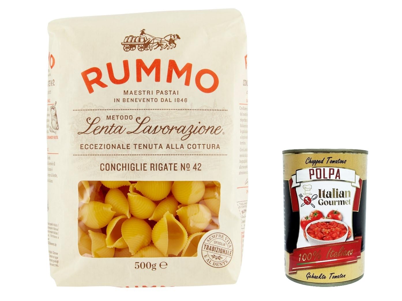 Italian Gourmet E.R. Rummo Conchiglie Rigate n.42 Pasta Lenta Lavorazione Durum Wheat Semolina 500 g Bronze Design + Italian Gourmet Pulp 400 g