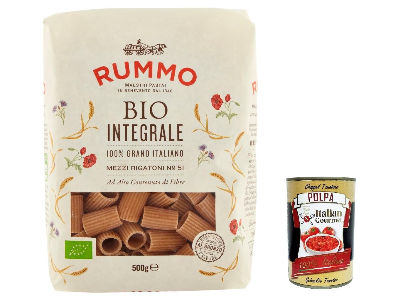 Italian Gourmet E.R. Rummo Pasta Integrale Mezzi Rigatoni No. 51 Pack of 20 Whole Grain Pasta 500g + Italian Gourmet Polpa 400g