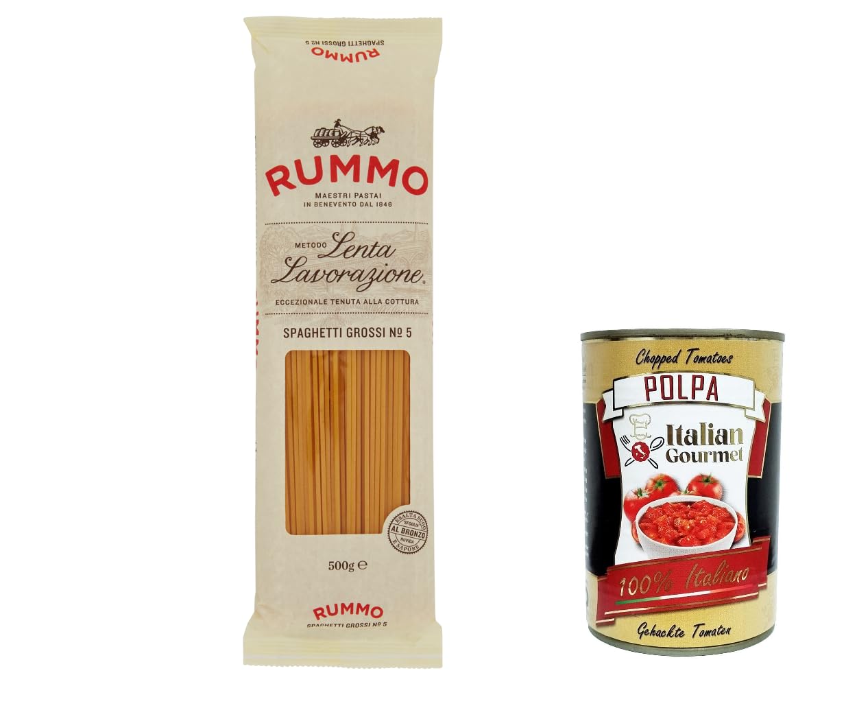 Rummo Spaghetti Grossi N. 5 Lot de 8 pâtes à la semoule de blé dur 500 g boîte italienne Gourmet Polpa di Pomodoro 400 g