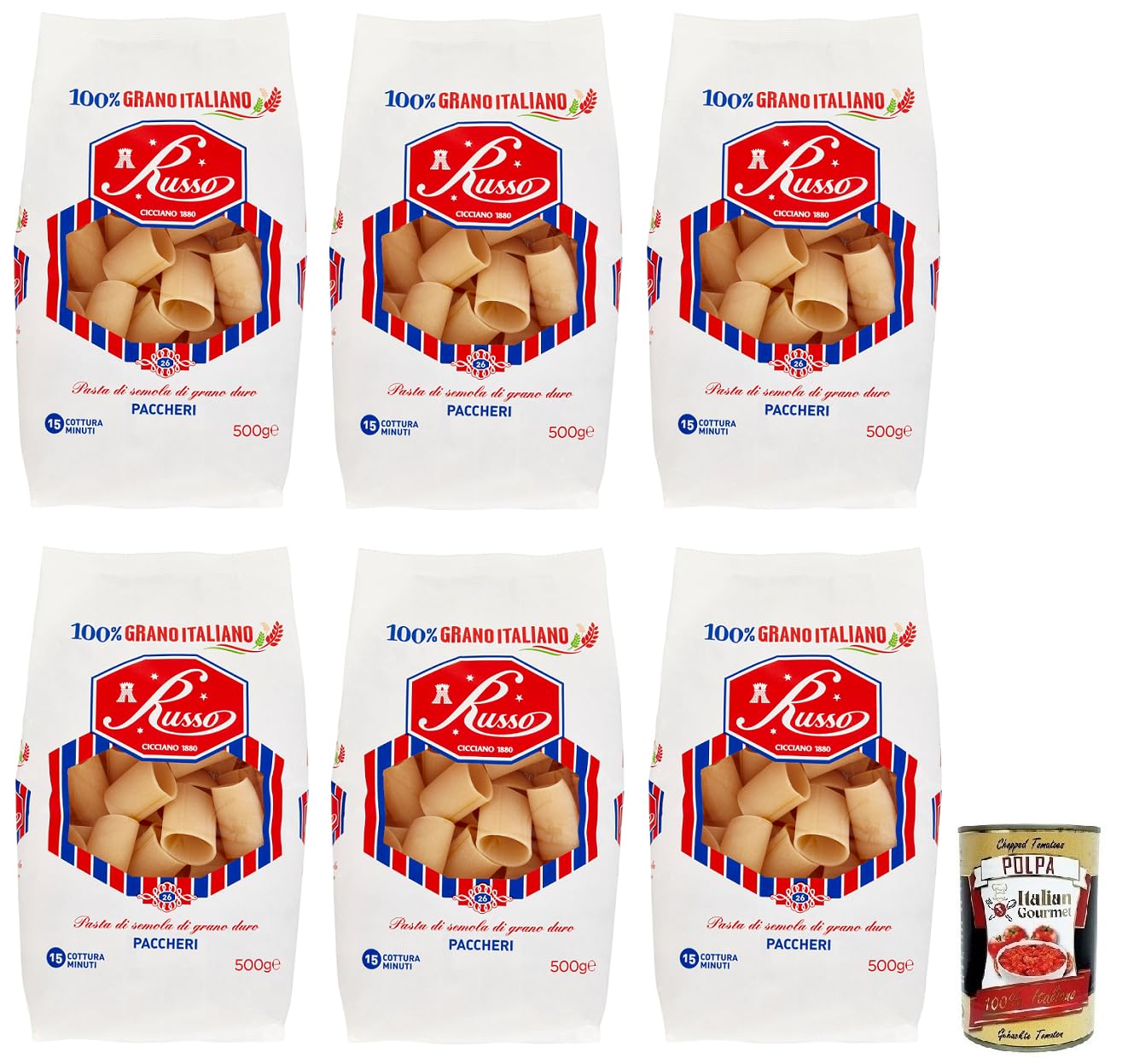 Russo Paccheri N 26 Lot de 6 pâtes à semoule de blé dur 100 blé italien 500 g boîte de 400 g