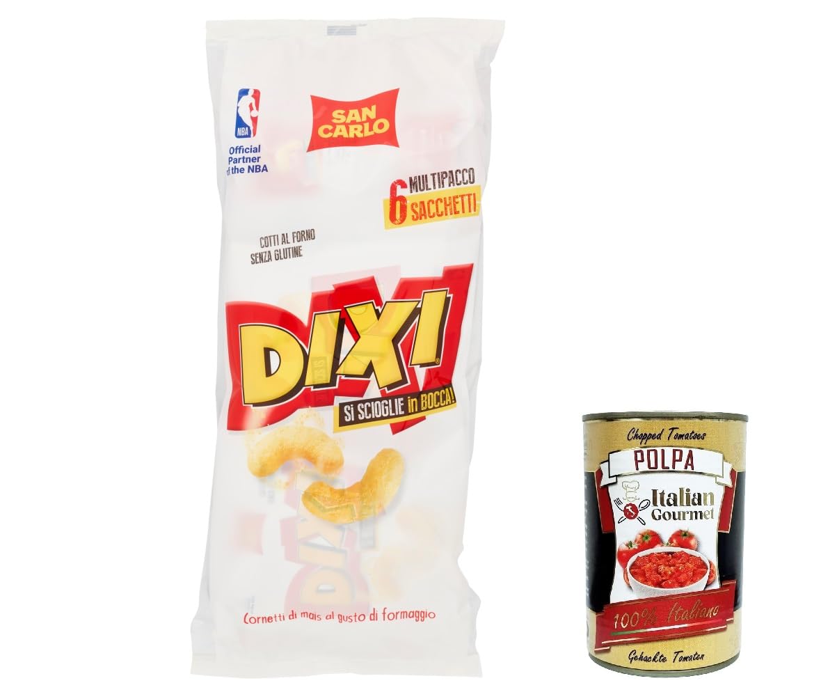 Italian Gourmet E.R. San Carlo Dixi Pack of 12 Oven-Baked Corn Chips Cheese Flavored Savory Snack 6 x 22g 132g with Gourmet Italian Polpa 400g
