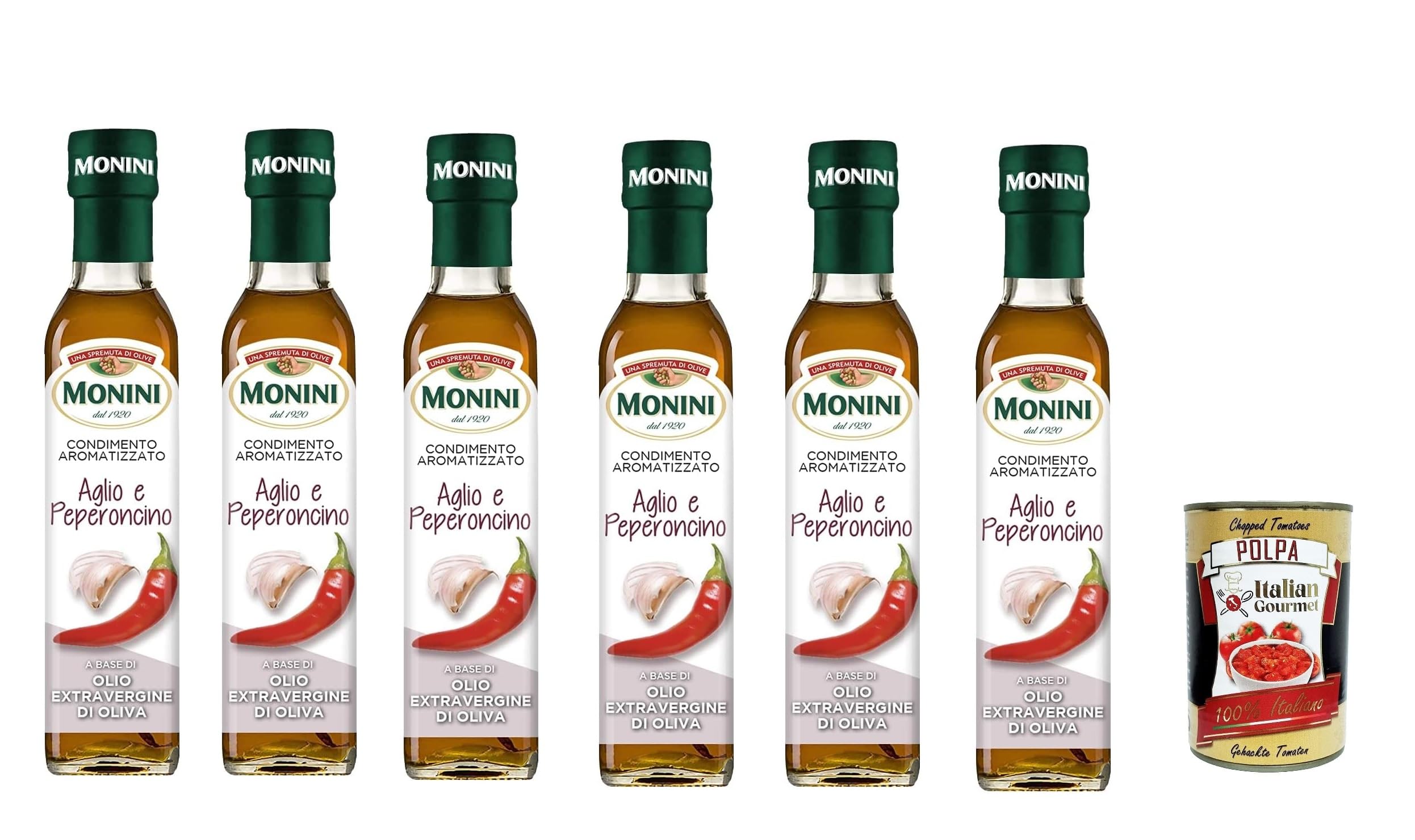 Italian Gourmet E.R. Set of 6 Monini Flavoured Spices with Extra Virgin Olive Oil 250ml + Italian Gourmet Polpa 400g