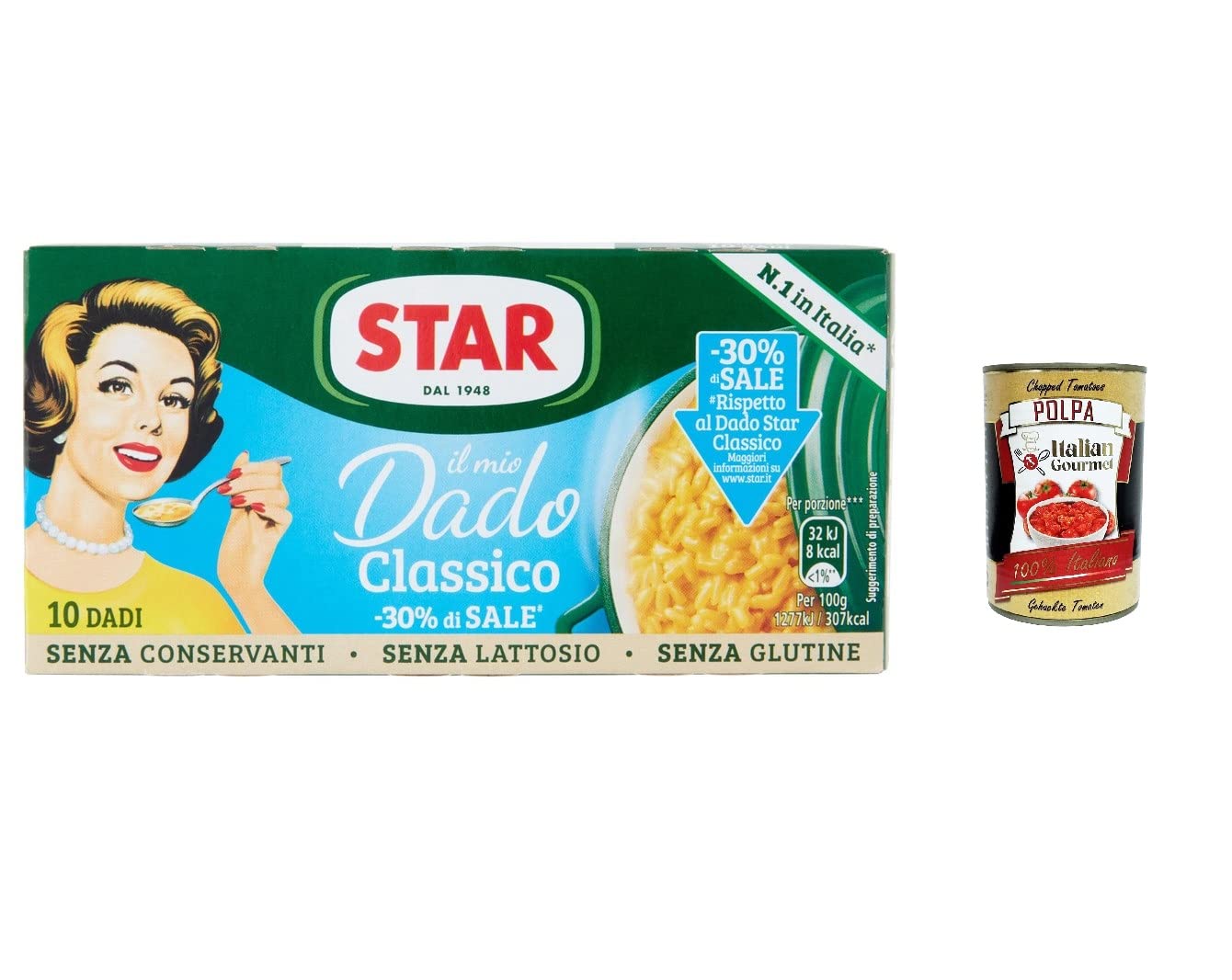 Italian Gourmet E.R. Star Il Mio Dado Classico Broth Cubes with 30% Less Salt Vegetables and Extra Virgin Olive Oil 10 Broth Cubes 100 g Preservative Lactose Free and Gluten Free + Italian Gourmet Polpa 400g