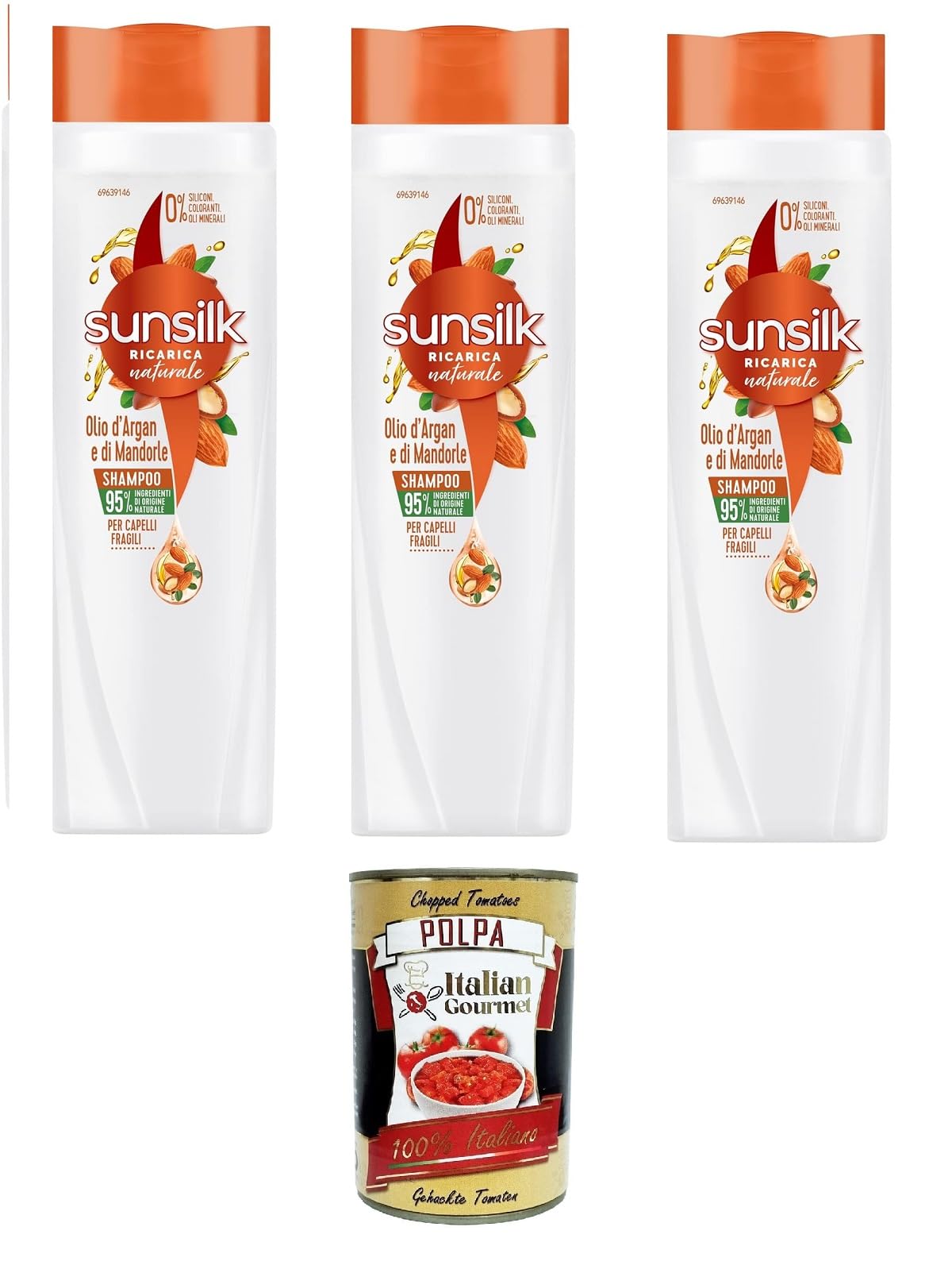 Organic argan and almond oils are known to be rich in vitamins and renowned for their nourishing and moisturizing properties. Is your hair brittle and damaged? This naturally derived detangling conditioner gives your hair resistance against breakage! Its formula, with 98 naturally derived ingredients and no silicone or mineral oils, nourishes and strengthens hair from root to tip, making it visibly stronger and restoring its natural shine. 98 naturally derived ingredients When using Sunsilk Argan Almond Oil Shampoo and Conditioner together, compared to a generic shampoo. Directions: Apply evenly to wet hair, massage gently, then rinse thoroughly. Avoid contact with eyes. In case of contact with eyes, rinse immediately. For best results, try the entire Sunsilk Argan and Almond Oil range. SAFETY WARNING For external use only. Avoid contact with eyes. Keep away from direct flame or heat sources.Sunsilk Argan and Almond Oil Line: Try the entire Sunsilk Argan and Almond Oil range for visibly strong and healthy hair. DIRECTIONS: Apply evenly to wet hair, massage gently, and rinse thoroughly. Avoid contact with eyes. In case of contact with eyes, rinse immediately. Nourishing Formula: 98 naturally derived ingredients, silicone- and mineral oil-free, nourishes and strengthens hair, making it visibly strong and restoring its natural shine. With Argan and Almond Oil: Argan oil and organic almond oil are known for their vitamin content and nourishing and moisturizing properties. Shampoo for Brittle Hair: Is your hair brittle and damaged? This naturally derived detangling shampoo gives your hair resistance to breakage! Free Gourmet Italian Gourmet Polpa di pomodoro, 400g.Sunsilk Shampooing à l'huile d'argan et d'amande pour cheveux cassants et abîmés à l'huile d'argan et à l'huile d'amande bio 3 x 250 ml Italian Gourmet Polpa 400 gDESCRIPTION DU PRODUIT DESCRIPTION DU PRODUIT L'huile d'argan et l'huile d'amande bio sont reconnues pour être riches en vitamines et reconnues pour leurs vertus nourrissantes et hydratantes. Vos cheveux sont-ils cassants et abîmés ? Cet après-shampoing démêlant d'origine naturelle confère à vos cheveux une résistance à la casse ! Sa formule à 98 d'ingrédients d'origine naturelle, sans silicone ni huiles minérales, nourrit et renforce les cheveux de la racine aux pointes, les rend visiblement fortifiants et restaure leur brillance naturelle. 98 d'ingrédients d'origine naturelle En combinant le shampooing et l'après-shampoing Sunsilk Argan Almond Oil par rapport à un shampooing générique. Mode d'emploi : appliquer uniformément sur cheveux mouillés, masser doucement puis rincer soigneusement. Évitez tout contact avec les yeux. En cas de contact avec les yeux, rincer immédiatement. Pour de meilleurs résultats, essayez toute la gamme d'huile d'argan et d'amande Sunsilk. AVERTISSEMENT DE SÉCURITÉ Pour un usage externe uniquement. Évitez tout contact avec les yeux. Tenir à l'écart de la flamme directe ou des sources de chaleur.Ligne d'huile d'argan et d'amande Sunsilk : essayez toute la gamme d'huile d'argan et d'amande Sunsilk pour des cheveux visiblement forts et sains. UTILISATION : Appliquer uniformément sur cheveux mouillés, masser doucement et rincer soigneusement. Évitez tout contact avec les yeux. En cas de contact avec les yeux, rincer immédiatement. Formule nourrissante : 98 d'ingrédients d'origine naturelle, sans silicone ni huiles minérales, nourrit et renforce les cheveux, les rend visiblement forts et restaure son éclat naturel. À l'huile d'argan et d'amande : l'huile d'argan et l'huile d'amande bio sont connues pour leur richesse en vitamines et leurs propriétés nourrissantes et hydratantes. Shampooing pour cheveux cassants : vos cheveux sont-ils cassants et abîmés ? Ce shampooing démêlant d'origine naturelle confère à vos cheveux une résistance à la casse !. Gourmet Italian Gourmet Polpa di pomodoro gratuit, 400 g.