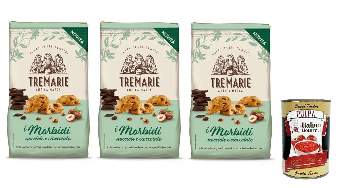 Tre Marie Biscotti i Morbidi Nocciole e Cioccolato Lot de 3 biscuits avec gouttes de chocolat et grains de noisettes croquants 300 g boîte italienne Gourmet Polpa di Pomodoro 400 g