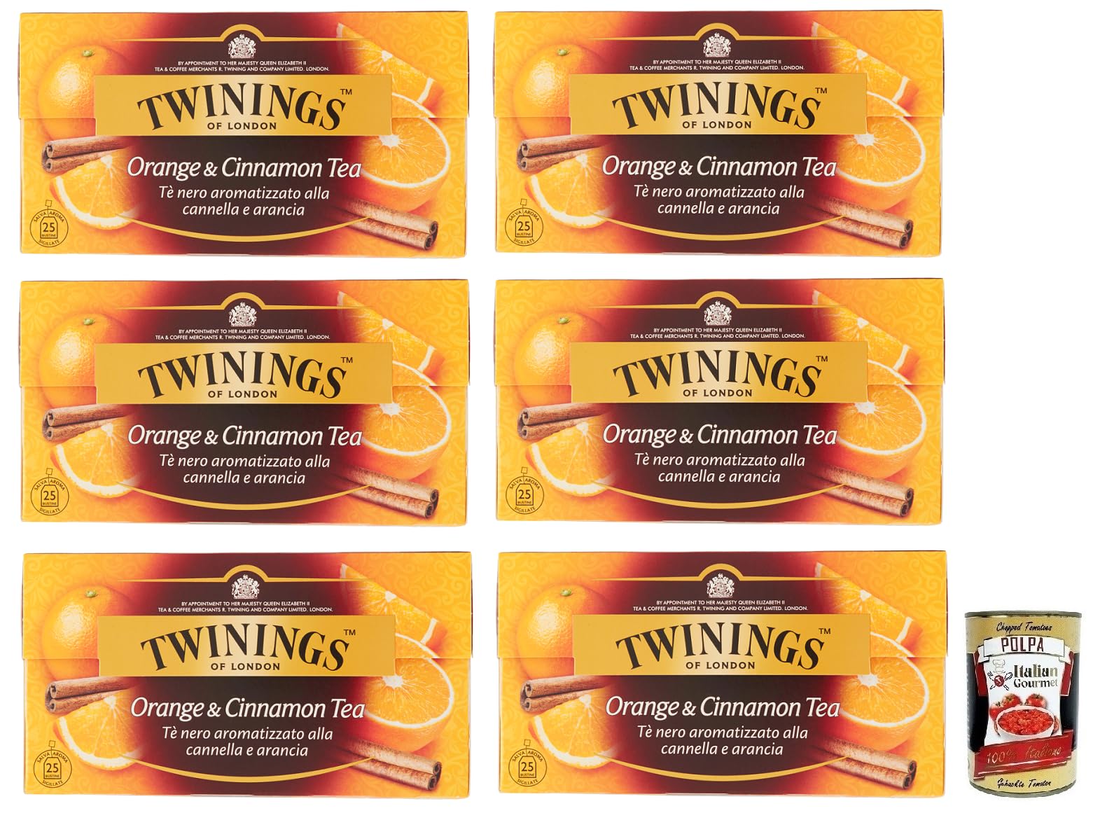 Italian Gourmet E.R. Twinings Cinnamon and Orange Flavored Black Tea Black Tea with Cinnamon and Orange Pack of 25 Filters + Italian Tin Gourmet Tomato Pulp 400 g