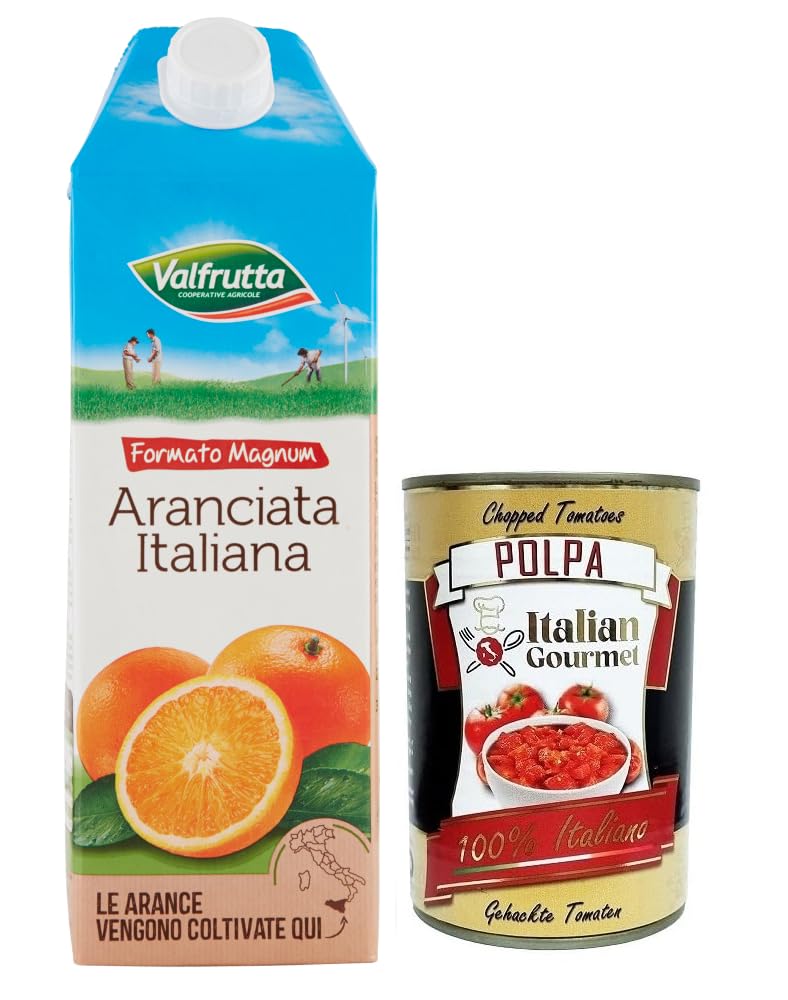 Italian Gourmet E.R. Valfrutta Aranciata Italiana Non-alcoholic refreshing drink Italian orange lemonade 1500 ml + 400 g box Gourmet Italian Polpa di Pomodoro