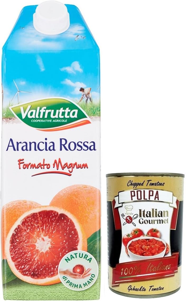 Italian Gourmet Polpa di Pomodoro 400g - Valfrutta Blood Orange has a distinctive taste because it is made from the fragrant juice of this particular citrus variety. A product with a characteristic taste, for complete enjoyment and energy. Our blood orange juice is proudly made in Italy by selecting the best and juiciest blood oranges with all the expertise of Valfrutta. Ingredients: Water, blood orange juice (30 ), sugar, glucose-fructose syrup, citric acid, flavorings, blackcurrant and carrot extract, color E120, gluten-free. Average nutritional values per 100 ml of product: Energy 49 kcal - 207 kJ - Fat 0.0 g, Carbohydrate 11.5 g (of which sugars 11.5 g), Protein 0.2 g, Fiber 0.1 g, Salt 0.0 g. INGREDIENTS Water, blood orange juice (30 ), sugar, glucose-fructose syrup, citric acid, flavorings, blackcurrant and carrot extract, color E120, gluten-freeValfrutta Succo Arancia Rossa Boisson rafraîchissante sans alcool, jus de fruits aromatisé à l'orange sanguine 1500 ml boîte italienne Gourmet Polpa di Pomodoro 400 gDESCRIPTION DU PRODUIT DESCRIPTION DU PRODUIT Gourmet italien Polpa di Pomodoro 400 g - L'orange sang Valfrutta a un goût distinctif car elle est obtenue à partir du jus parfumé de cette variété particulière d'agrumes. Un produit au goût caractéristique, pour un plaisir et une énergie complets. Notre jus d'orange sanguine est fièrement fabriqué en Italie en sélectionnant les meilleures et les plus juteuses oranges sanguines avec tout le savoir-faire de Valfrutta. Ingrédients : eau, jus d'orange sanguine (30 ), sucre, sirop de glucose-fructose, acidifiant acide citrique, arômes, extrait de cassis et de carotte, colorant E120, sans gluten Valeurs nutritionnelles moyennes pour 100 ml de produit Énergie 49 kcal - 207 kJ - Matières grasses 0,0 g 0,0 g de glucides 11,5 g dont sucre 11,5 g de protéines 0,2 g de fibres 0,1 g de sel 0,0 g INGRÉDIENTS Eau, jus d'orange sanguine (30 ), sucre, sirop de glucose-fructose, acidifiant acide citrique, arômes, extrait de cassis et de carotte, colorant E120, sans gluten
