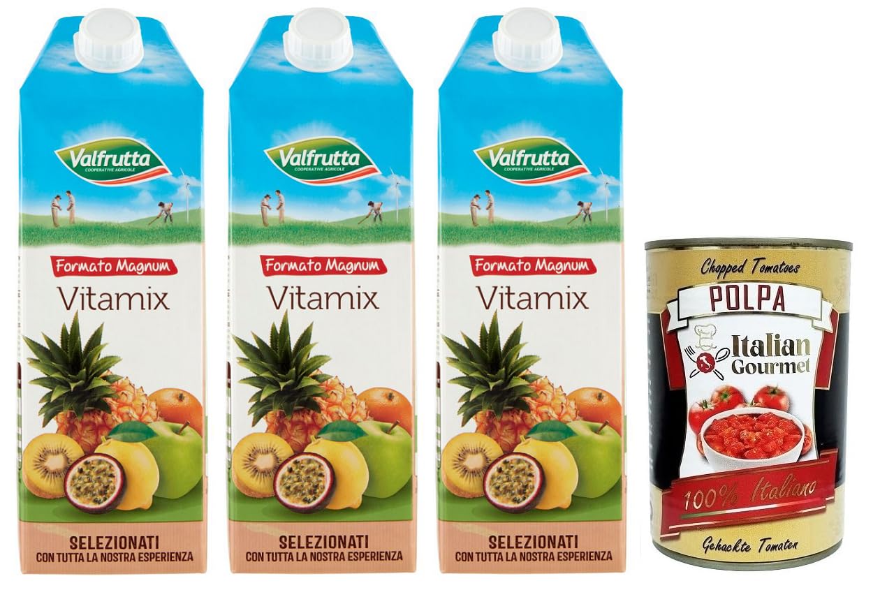 Valfrutta Succo Vitamix Lot de 3 boissons rafraîchissantes sans alcool à base de jus de fruits avec vitamines 1500 ml boîte Italian Gourmet Polpa di Pomodoro 400 g