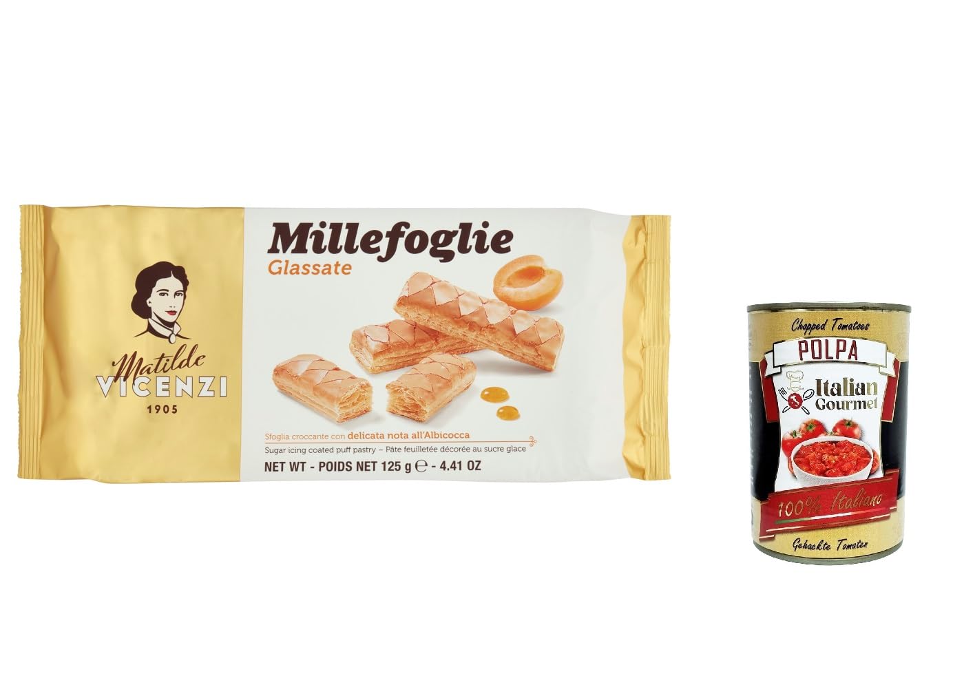 Italian Gourmet E.R. Vicenzi MilleFoglie D'Italia Apricot Covered Mini Snacks with Apricot Glaze 125g + Italian Gourmet Pulp 400g (Pack of 6)