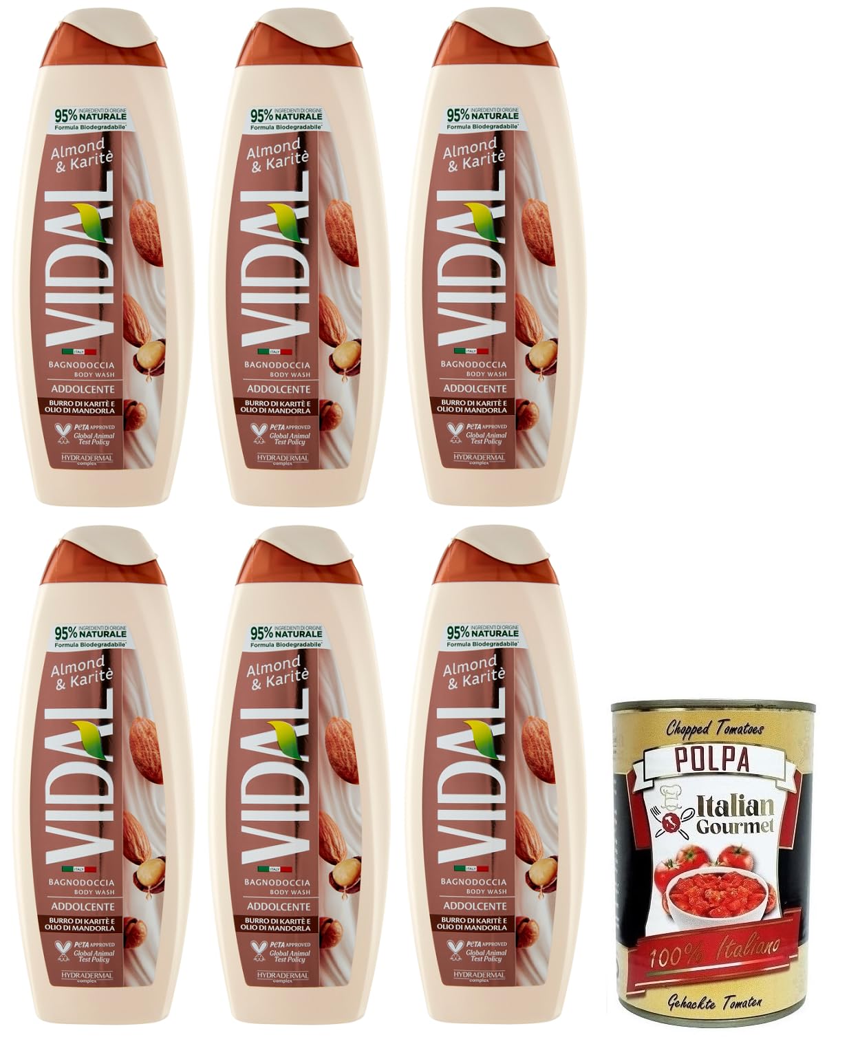 Ingredients: Aqua, Sodium Laureth Sulfate, Sodium Chloride, Cocamidopropyl Betaine, Parfum, Prunus Amygdalus Dulcis Oil, Butyrospermum Parkii (Shea) Oil, Sodium PCA Butter, Glycerin, Sorbitol, Polyquaternium-7, PEG-40, Hydrogenated Castor Oil, Styrene Acrylic Disodium Copolymer, EDTA, Citric Acid, Triumlac Acid Lactate, DMDM Hydantoin, Methylchlorisothiazolinone, Methylisothiazolinone, Benzyl Salicylate, Hexyl Citronellal, Hydroxycitronellal. The formula is enriched with innovative Hydradermal Technology, a complex of dermo-cosmetic active ingredients with a moisturizing action that leaves skin softer, more velvety, and radiant. The fragrance is soft and enveloping, with top notes of citrus and a slightly caramelized base. Enriched with almond oil and shea butter, known for their moisturizing and soothing properties, it leaves skin feeling deliciously soft and silky. Free Italian Gourmet Polpa di Pomodoro, 400g tin.Lot de 6 gels douche Vidal Almond Karitè Bagnodoccia avec beurre de karité et huile d'amande, 500 ml Polpa di Pomodoro Italian Gourmet Polpa di Pomodoro 400 gIngrédients Aqua laureth sulfate de sodium Chlorure de sodium Cocamidopropylbétaïne Parfum Prunus Amygdalus Dulcis Huile Butyrospermum Parki Beurre de sodium PCA Glycérine Sorbitol Polyquaternium-7 PEG-40 Huile de ricin hydrogénée Styrène Acrylique Copolymère disodique EDTA acide citrique lactatate de triumlacAcide DMDM hydantoïne méthylchlorisothiazolinone méthylisothiazolinone benzylsalicylate hexylcannelle hydroxycitronellal. La formule est enrichie de la technologie innovante Hydradermal, un complexe d'actifs dermocosmétiques à action hydratante qui rend la peau plus douce, veloutée et éclatante. Le parfum est doux et enveloppant, avec des notes de tête d'agrumes et un fond légèrement caramélisé. Enrichi en huile d'amande et de beurre de karité aux propriétés hydratantes et apaisantes, il donne à la peau une délicieuse sensation de douceur et de soyeux. Polpa di Pomodoro Gourmet italienne gratuite, boîte de 400 g.