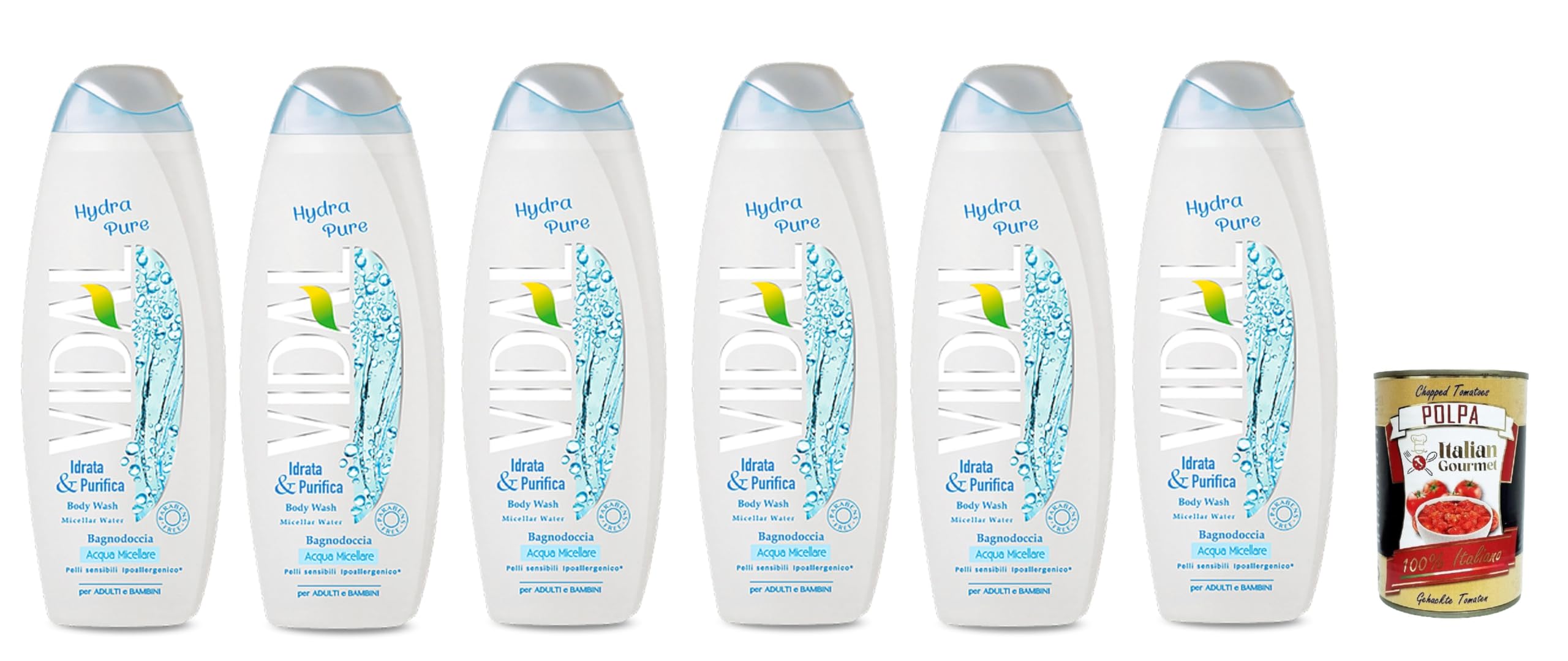 Ingredients: Water, Sodium Laureth Sulfate, Sodium Chloride, Cocamidopropyl Betaine, Glycerin, Fragrance, Glyceryl Oleate, Coco-Glucoside, Polyquaternium-7, PEG-40 Hydrogenated Castor Oil, Disodium EDTA, Sodium Lactate, Lactic Acid, Sodium Benzoate, Phenoxyethanol INGREDIENTS Ingredients: Water, Sodium Laureth Sulfate, Sodium Chloride, Cocamidopropyl Betaine, Glycerin, Fragrance, Glyceryl Oleate, Coco-Glucoside, Polyquaternium-7, PEG-40 Hydrogenated Castor Oil, Disodium EDTA, Sodium Lactate, Lactic Acid, Sodium Benzoate, Phenoxyethanol SAFETY WARNING Formulated and clinically tested in vitro and in vivo to minimize the risk of tested allergies Dermatologically tested No animal-derived ingredients. See moreIngredients: Water, sodium laureth sulfate, sodium chloride, cocamidopropyl betaine, glycerin, fragrance, glyceryl oleate, cocoglucoside, polyquaternium-7, PEG-40 hydrogenated castor oil, disodium EDTA, sodium lactate, lactic acid, sodium benzoate, phenoxyethanol. The hypoallergenic formula is deliberately tested on even the most sensitive skin and is particularly suitable for children. The first body wash to use innovative micellar water to gently cleanse, moisturize, and remove impurities. The delicate, fresh fragrance envelops you in a soft lather and is perfect for the whole family. Free 400g gourmet Italian tomato pulp.Vidal Bagnoschiuma Hydra Pure Lot de 6 bains moussants de bain 500 ml Soin et nettoyage du corps Italian Gourmet Polpa 400 gDESCRIPTION DU PRODUIT DESCRIPTION DU PRODUIT Ingrédients : eau, laureth sulfate de sodium, chlorure de sodium, bétaine de cocamidopropyle, glycérine, parfum, glycéryle, oléate de glycéryle, cocoglucoside, polyquaternium-7, huile de castor hydrogénée PEG-40, EDTA disodium, lactate de sodium, acide lactique, benzoate de sodium, phénoxyéthanol INGRÉDIENTS Ingrédients : eau, laureth sulfate de sodium, chlorure de sodium, bétaine de cocamidopropyle, glycérine, parfum, glycéryle, oléate de glycéryle, cocoglucoside, polyquaternium-7, huile de castor hydrogénée PEG-40, EDTA disodium, lactate de sodium, acide lactique, benzoate de sodium, phénoxyéthanol AVERTISSEMENT DE SÉCURITÉ Formule et testées cliniquement in vitro et in vivo pour minimiser le risque d'allergies testées dermatologiquement Sans ingrédients d'origine animale. Voir plusIngrédients : eau, laureth sulfate de sodium, chlorure de sodium, bétaine de cocamidopropyle, glycérine, parfum, glycéryle, oléate de glycéryle, cocoglucoside, polyquaternium-7, huile de castor hydrogénée PEG-40, EDTA disodium, lactate de sodium, acide lactique, benzoate de sodium, phénoxyéthanol. La formule hypoallergénique est délibérément testée sur les peaux les plus sensibles et s'avère particulièrement adaptée même aux enfants. Le premier lavage corporel à utiliser l'eau micellaire innovante pour nettoyer, hydrater et éliminer en douceur les impuretés. Le parfum délicat et frais vous enveloppe d'une mousse douce et est parfait pour toute la famille. Polpa di pomodoro italien gourmet gratuit 400 g.