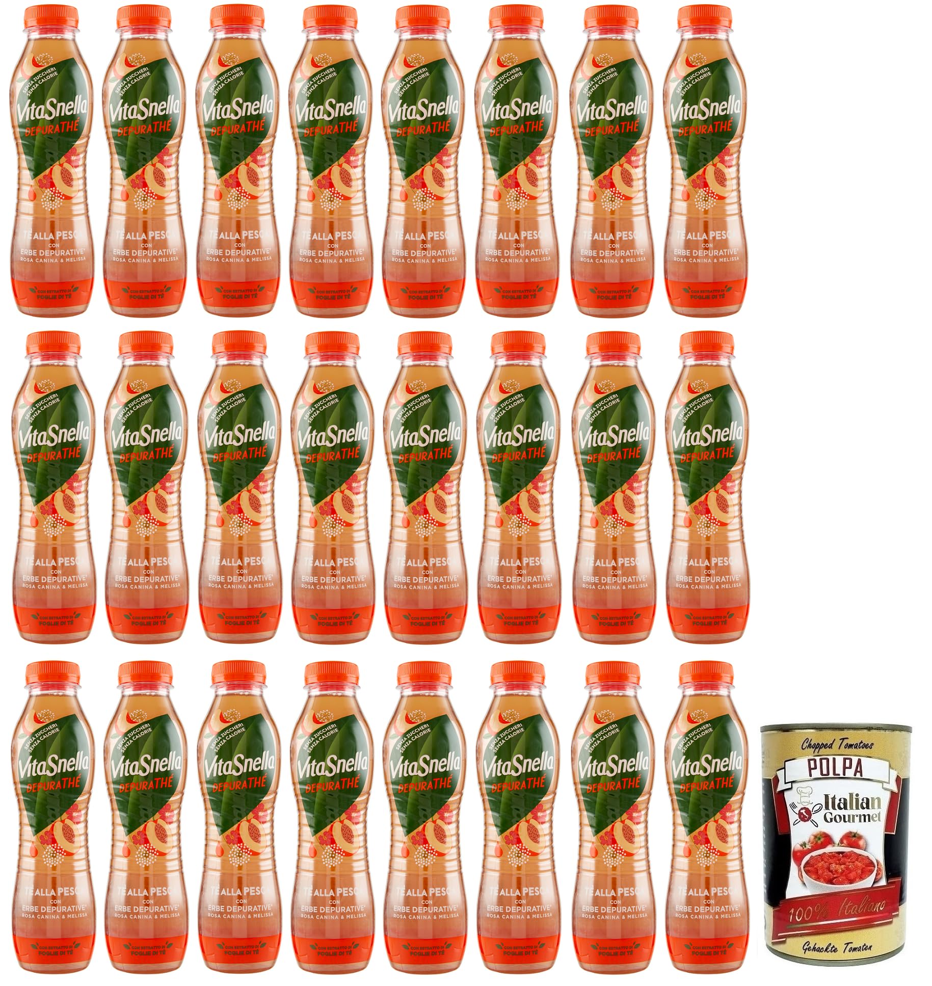 Vitasnella Depurathé Tè alla Pesca Lot de 24 thés glacés aux pêches avec herbes nettoyantes, cynorrhodons et mélisse, sans sucre jetable PET 500 ml Italian Gourmet Polpa di Pomodoro Boîte de 400 g