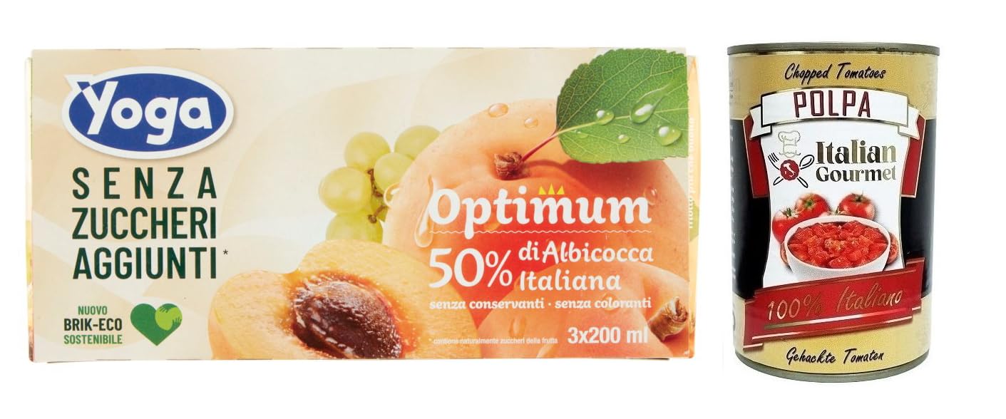 Polpa di Pomodoro 400g - Yoga Optimum fruit juices are now available without added sugar, in a variety of convenient options for any time of day, for a healthy and balanced daily diet. Prepared with the finest apricots, exclusively from Italian orchards, to offer the very best to children. This has been Yoga's great promise since 1946. Yoga Optimum, with no added sugar and 50 Italian apricot, is one of the most popular flavors in the Yoga Optimum range, Italy's No. 1 juice line. A recipe rich in fruit (99 ), delicious, and nutrient-dense thanks to vitamin C and natural minerals from Italian agriculture. Something unique to drink at any time of day, and safe for little ones. INGREDIENTS: Apricot puree 50 , concentrated grape juice, natural flavorings, vitamin C. Gluten-free. NUTRITIONAL INFORMATION (average values per 100 ml) ENERGY 229 kJ - 54 kcal FAT 0.1 g of which saturates 0.0 g CARBON HYDRATE 12.0 g of which sugars 12.0 g Fiber 0.8 g Protein 0.3 g Salt 0.0 g Vitamin C: 16 mg INGREDIENTS Apricot puree 50 , concentrated grape juice, natural flavorings, vitamin C. Gluten-free.Yoga Succhi di Frutta Optimum Albicocca, fruitée abricot, sans sucre ajouté, boisson rafraîchissante sans alcool, 3 x 200 ml Italian Gourmet Polpa di Pomodoro Boîte de 400 gDESCRIPTION DU PRODUIT DESCRIPTION DU PRODUIT Polpa di Pomodoro 400 g - Les jus de fruits Yoga Optimum sont désormais disponibles sans sucre ajouté, dans de nombreuses solutions à tout moment, pour une alimentation saine et correcte au quotidien. Préparé avec les meilleurs abricots issus exclusivement de cultures italiennes pour offrir le meilleur aux enfants. C'est la grande promesse du yoga depuis 1946. Le yoga optimal sans sucre ajouté 50 d'abricot italien est l'une des saveurs les plus populaires du yoga et de l'Optimum, la ligne de jus n 1 en Italie. Une recette riche en fruits (99 ), savoureuse et riche en nutriments : grâce à la vitamine C et aux sels minéraux naturels issus de l'agriculture italienne. Quelque chose d'unique à boire à tout moment de la journée et que les petits peuvent manger en toute sécurité. INGRÉDIENTS Purée d'abricot 50 , jus de raisin concentré, arômes naturels, vitamine C. Sans gluten. VALEURS NUTRITIONNELLES (valeurs moyennes pour 100 ML) ÉNERGIE 229 kj - 54 kcal GRAISSES 0,1 g DONT Saturé 0,0 g HYDRATE DE CHARBON 12,0 g DONT SUCRE 12,0 g Fibres 0,8 g Protéines 0,3 g Sel 0,0 g. Vitamine : 16 mg INGRÉDIENTS Purée d'abricot 50 , jus de raisin concentré, arômes naturels, vitamine C. Sans gluten.